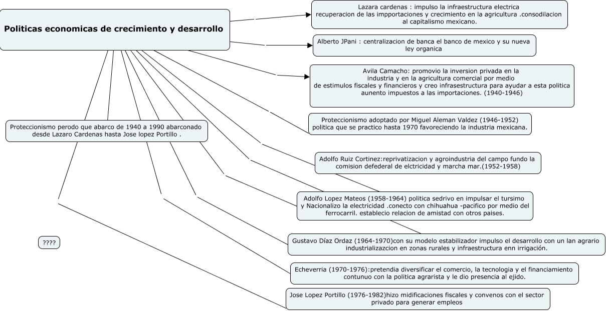 Este Cmap, tiene información relacionada con: unidad 2 taea 3, Politicas economicas de crecimiento y desarrollo Echeverria (1970-1976):pretendia diversificar el comercio, la tecnologia y el financiamiento contunuo con la politica agrarista y le dio presencia al ejido., Politicas economicas de crecimiento y desarrollo Jose Lopez Portillo (1976-1982)hizo midificaciones fiscales y convenos con el sector privado para generar empleos, Politicas economicas de crecimiento y desarrollo Alberto JPani : centralizacion de banca el banco de mexico y su nueva ley organica, Politicas economicas de crecimiento y desarrollo Gustavo Díaz Ordaz (1964-1970)con su modelo estabilizador impulso el desarrollo con un lan agrario industrializazcion en zonas rurales y infraestructura enn irrigación., Politicas economicas de crecimiento y desarrollo Gustavo Díaz Ordaz (1964-1970)con su modelo estabilizador impulso el desarrollo con un lan agrario industrializazcion en zonas rurales y infraestructura enn irrigación., Politicas economicas de crecimiento y desarrollo Lazara cardenas : impulso la infraestructura electrica recuperacion de las impportaciones y crecimiento en la agricultura .consodilacion al capitalismo mexicano., Politicas economicas de crecimiento y desarrollo Adolfo Lopez Mateos (1958-1964) politica sedrivo en impulsar el tursimo y Nacionalizo la electricidad .conecto con chihuahua -pacifico por medio del ferrocarril. establecio relacion de amistad con otros paises., Politicas economicas de crecimiento y desarrollo Adolfo Lopez Mateos (1958-1964) politica sedrivo en impulsar el tursimo y Nacionalizo la electricidad .conecto con chihuahua -pacifico por medio del ferrocarril. establecio relacion de amistad con otros paises., Politicas economicas de crecimiento y desarrollo Avila Camacho: promovio la inversion privada en la industria y en la agricultura comercial por medio de estimulos fiscales y financieros y creo infrasestructura para ayudar a esta politica aunento impuestos a las importaciones. (1940-1946), Politicas economicas de crecimiento y desarrollo ???? Proteccionismo perodo que abarco de 1940 a 1990 abarconado desde Lazaro Cardenas hasta Jose lopez Portillo ., Politicas economicas de crecimiento y desarrollo Proteccionismo adoptado por Miguel Aleman Valdez (1946-1952) politica que se practico hasta 1970 favoreciendo la industria mexicana.