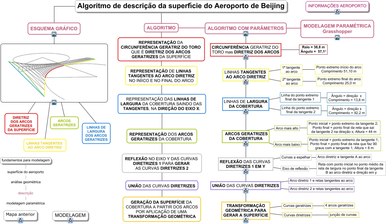 Esse mapa conceitual, produzido no IHMC CmapTools, tem a informação relacionada a: algoritmo_superf_aeroporto_beijing, superfície do aeroporto análise geométrica, Linha do ponto extremo final da tangente 1 Ângulo = direção x Comprimento = 13,8 m, 2ª tangente ao arco Ponto extremo final do arco Comprimento 25,0 m, UNIÃO DAS CURVAS DIRETRIZES GERAÇÃO DA SUPERFÍCIE DA COBERTURA A PARTIR DOS ARCOS POR APLICAÇÃO DE UMA TRANSFORMAÇÃO GEOMÉTRICA, LINHAS DE LARGURA DA COBERTURA Linha do ponto extremo final da tangente 1, UNIÃO DAS CURVAS DIRETRIZES Arco diretriz 2 e retas tangentes ao arco, 1ª tangente ao arco Ponto extremo início do arco Comprimento 51,10 m, ALGORITMO, CIRCUNFERÊNCIA GERATRIZ DO TORO mas DIRETRIZ DOS ARCOS LINHAS TANGENTES AO ARCO DIRETRIZ, TRANSFORMAÇÃO GEOMÉTRICA PARA GERAR A SUPERFÍCIE Curvas diretrizes, REFLEXÃO DAS CURVAS DIRETRIZES 1 EM Y UNIÃO DAS CURVAS DIRETRIZES, Curvas a espelhar Arco diretriz e tangente A ao arco, ALGORITMO COM PARÂMETROS MODELAGEM PARAMÉTRICA Grasshopper, LINHAS DE LARGURA DA COBERTURA ARCOS GERATRIZES DA COBERTURA, LINHAS TANGENTES AO ARCO DIRETRIZ 1ª tangente ao arco, Arco mais alto Ponto inicial = ponto extremo da tangente 2; Ponto final = ponto final da reta que sai da tangente 2 na direção x; Altura = 44 m, Eixo de reflexão Reta com ponto inicial no ponto médio da reta de largura no ponto final da tangente B ao arco diretriz e direção em y, ESQUEMA GRÁFICO Algoritmo de descrição da superfície do Aeroporto de Beijing, descrição modelagem paramétrica, LINHAS DE LARGURA DA COBERTURA Linha do ponto extremo final da tangente 2