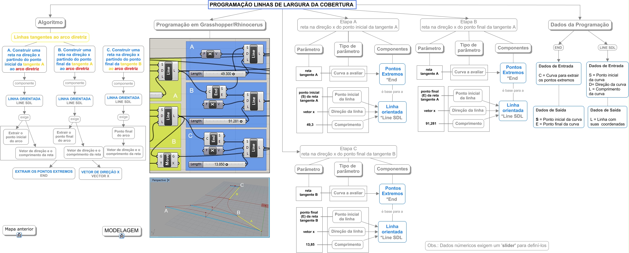 Esse mapa conceitual, produzido no IHMC CmapTools, tem a informação relacionada a: programação_largura_arcos_geratrizes, Componentes Pontos Extremos *End, Algoritmo Linhas tangentes ao arco diretriz, Ponto final do arco Vetor de direção e o comprimento da reta, Linhas tangentes ao arco diretriz A. Construir uma reta na direção x partindo do ponto inicial da tangente A ao arco diretriz, 49,3 Comprimento, PROGRAMAÇÃO LINHAS DE LARGURA DA COBERTURA Etapa A reta na direção x do ponto inicial da tangente A Tipo de parâmetro, vetor x Direção da linha, Parâmetro, Curva a avaliar Pontos Extremos *End, Pontos Extremos *End é base para a Linha orientada *Line SDL, reta tangente A Curva a avaliar, PROGRAMAÇÃO LINHAS DE LARGURA DA COBERTURA Etapa C reta na direção x do ponto final da tangente B Parâmetro, VETOR DE DIREÇÃO X VECTOR X, vetor x Direção da linha, Pontos Extremos *End é base para a Linha orientada *Line SDL, PROGRAMAÇÃO LINHAS DE LARGURA DA COBERTURA Etapa A reta na direção x do ponto inicial da tangente A Parâmetro, A. Construir uma reta na direção x partindo do ponto inicial da tangente A ao arco diretriz componente LINHA ORIENTADA LINE SDL, PROGRAMAÇÃO LINHAS DE LARGURA DA COBERTURA Algoritmo, Curva a avaliar Pontos Extremos *End, LINHA ORIENTADA LINE SDL exige Extrair o ponto inicial do arco