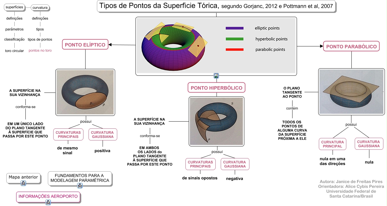 Esse mapa conceitual, produzido no IHMC CmapTools, tem a informação relacionada a: tipos_pontos_toro, superfícies definições, parâmetros classificação, PONTO HIPERBÓLICO, CURVATURA PRINCIPAL nula em uma das direções, superfícies curvatura, A SUPERFÍCIE NA SUA VIZINHANÇA conforma-se EM UM ÚNICO LADO DO PLANO TANGENTE Â SUPERFÍCIE QUE PASSA POR ESTE PONTO, A SUPERFÍCIE NA SUA VIZINHANÇA, PONTO PARABÓLICO, CURVATURA GAUSSIANA negativa, possui CURVATURAS PRINCIPAIS, definições tipos, Tipos de Pontos da Superfície Tórica, segundo Gorjanc, 2012 e Pottmann et al, 2007, CURVATURAS PRINCIPAIS de sinais opostos, PONTO PARABÓLICO, possui CURVATURA GAUSSIANA, tipos de pontos pontos no toro, possui CURVATURA GAUSSIANA, CURVATURA GAUSSIANA nula, A SUPERFÍCIE NA SUA VIZINHANÇA, classificação toro circular