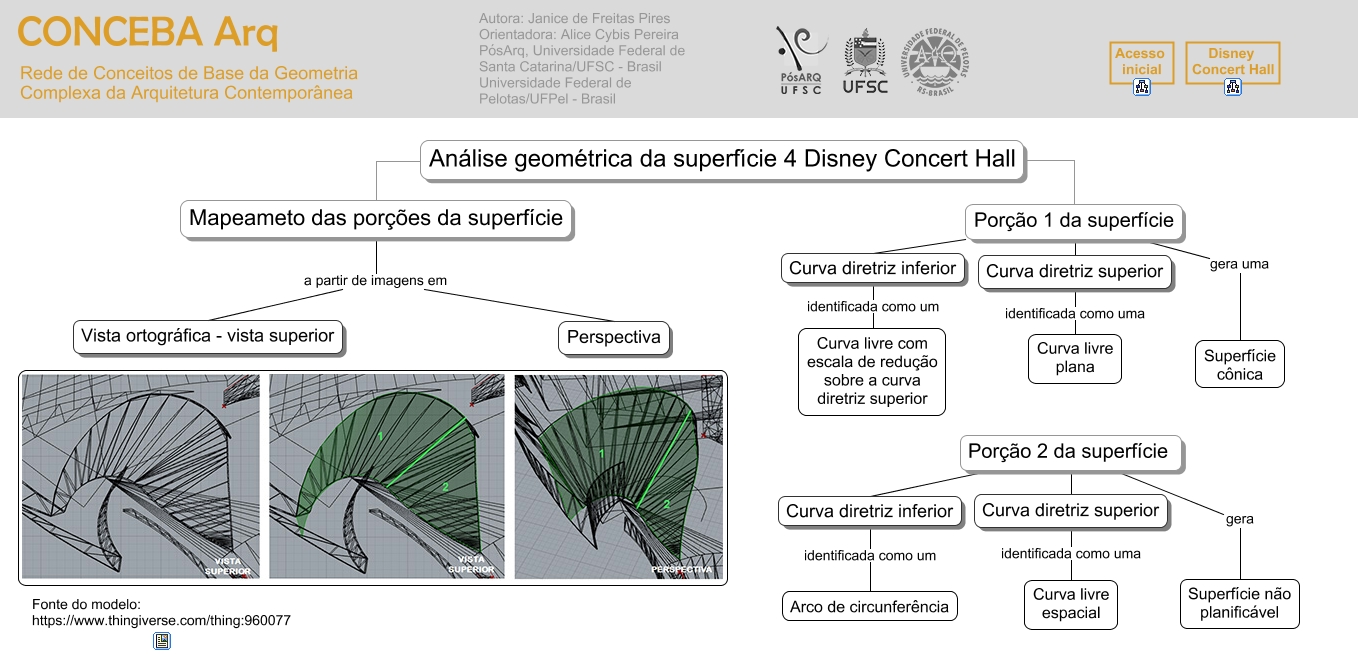 Esse mapa conceitual, produzido no IHMC CmapTools, tem a informação relacionada a: analise_geometrica_superf_4, Análise geométrica da superfície 4 Disney Concert Hall Porção 1 da superfície, Porção 2 da superfície Curva diretriz inferior, Porção 1 da superfície Curva diretriz inferior, Curva diretriz inferior identificada como um Curva livre com escala de redução sobre a curva diretriz superior, Curva diretriz inferior identificada como um Arco de circunferência, Curva diretriz superior identificada como uma Curva livre espacial, Mapeameto das porções da superfície a partir de imagens em Vista ortográfica - vista superior, Mapeameto das porções da superfície a partir de imagens em Perspectiva, Porção 2 da superfície Curva diretriz superior, Curva diretriz superior identificada como uma Curva livre plana, Porção 2 da superfície gera Superfície não planificável, Análise geométrica da superfície 4 Disney Concert Hall Mapeameto das porções da superfície, Porção 1 da superfície Curva diretriz superior, Porção 1 da superfície gera uma Superfície cônica