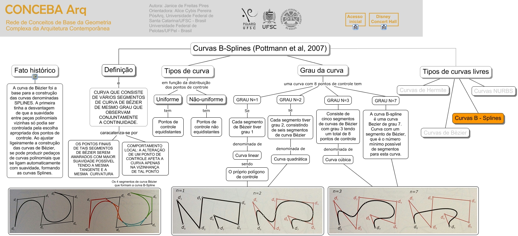 Esse mapa conceitual, produzido no IHMC CmapTools, tem a informação relacionada a: curvas_B_Splines, Curva linear sendo O próprio polígono de controle, Tipos de curva em função da distribuição dos pontos de controle Uniforme, Não-uniforme tem Pontos de controle não equidistantes, Uniforme tem Pontos de controle equidistantes, Grau da curva uma curva com 8 pontos de controle tem GRAU N=2, Definição é CURVA QUE CONSISTE DE VÁRIOS SEGMENTOS DE CURVA DE BÈZIER DE MESMO GRAU QUE OBSERVAM CONJUNTAMENTE A CONTINUIDADE., Consiste de cinco segmentos de curvas de Bèzier com grau 3 tendo um total de 8 pontos de controle denominada de Curva cúbica, Curvas B-Splines (Pottmann et al, 2007) Grau da curva, Cada segmento tiver grau 2, consistindo de seis segmentos de curva Bèzier denominada de Curva quadrática, Os 4 segmentos de curva Bèzier que formam a curva B-Spline, Fato histórico A curva de Bèzier foi a base para a construção das curvas denominadas SPLINES. A primeira tinha a desvantagem de que a suavidade entre peças polinomiais vizinhas só podia ser controlada pela escolha apropriada dos pontos de controle. Ao ajustar ligeiramente a construção das curvas de Bézier, se pode produzir pedaços de curvas polinomiais que se ligam automaticamente com suavidade, formando as curvas Splines., GRAU N=7 A curva B-spline é uma curva Bezier de grau 7. Curva com um segmento de Bèzier, que é o número mínimo possível de segmentos para esta curva., A curva B-spline é uma curva Bezier de grau 7. Curva com um segmento de Bèzier, que é o número mínimo possível de segmentos para esta curva., Tipos de curvas livres Curvas de Bèzier, Tipos de curvas livres Curvas de Hermite, Grau da curva uma curva com 8 pontos de controle tem GRAU N=3, Curvas B-Splines (Pottmann et al, 2007) Tipos de curvas livres, O próprio polígono de controle, Cada segmento de Bèzeir tiver grau 1 denominada de Curva linear, Grau da curva uma curva com 8 pontos de controle tem GRAU N=7