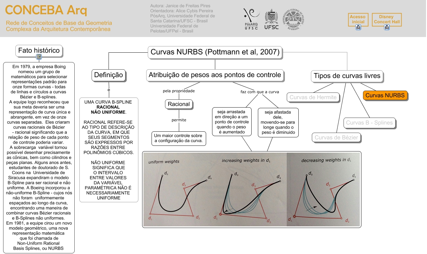 Esse mapa conceitual, produzido no IHMC CmapTools, tem a informação relacionada a: curvas_NURBS, Curvas NURBS (Pottmann et al, 2007) Tipos de curvas livres, Curvas NURBS (Pottmann et al, 2007) Definição, Tipos de curvas livres Curvas B - Splines, Atribuição de pesos aos pontos de controle faz com que a curva seja arrastada em direção a um ponto de controle quando o peso é aumentado, Tipos de curvas livres Curvas de Hermite, Atribuição de pesos aos pontos de controle pela propriedade Racional, seja afastada dele, movendo-se para longe quando o peso é diminuido, Curvas NURBS (Pottmann et al, 2007) Atribuição de pesos aos pontos de controle, Atribuição de pesos aos pontos de controle faz com que a curva seja afastada dele, movendo-se para longe quando o peso é diminuido, seja arrastada em direção a um ponto de controle quando o peso é aumentado, Tipos de curvas livres Curvas de Bèzier, Tipos de curvas livres Curvas NURBS, Fato histórico Em 1979, a empresa Boing nomeou um grupo de matemáticos para selecionar representações padrão para onze formas curvas - todas de linhas e círculos a curvas Bézier e B-splines. A equipe logo reconheceu que sua meta deveria ser uma representação de curva única e abrangente, em vez de onze curvas separadas. Eles criaram curvas racionais de Bézier - racional significando que a relação de peso de cada ponto de controle poderia variar. A sobrecarga variável tornou possível desenhar precisamente as cônicas, bem como cilindros e peças planas. Alguns anos antes, estudantes de doutorado de S. Coons na Universidade de Siracusa expandiram o modelo B-Spline para ser racional e não uniforme. A Boeing incorporou a não-uniforme B-Spline - cujos nós não foram uniformemente espaçados ao longo da curva, encontrando uma maneira de combinar curvas Bézier racionais e B-Splines não uniformes. Em 1981, a equipe cirou um novo modelo geométrico, uma nova representação matemática que foi chamada de Non-Uniform Rational Basis Splines, ou NURBS, Racional permite Um maior controle sobre a configuração da curva., Definição é UMA CURVA B-SPLINE RACIONAL NÃO UNIFORME. RACIONAL REFERE-SE AO TIPO DE DESCRIÇÃO DA CURVA, EM QUE SEUS SEGMENTOS SÃO EXPRESSOS POR RAZÕES ENTRE POLINÔMIOS CÚBICOS. NÃO UNIFORME SIGNIFICA QUE O INTERVALO ENTRE VALORES DA VARIÁVEL PARAMÉTRICA NÃO É NECESSARIAMENTE UNIFORME