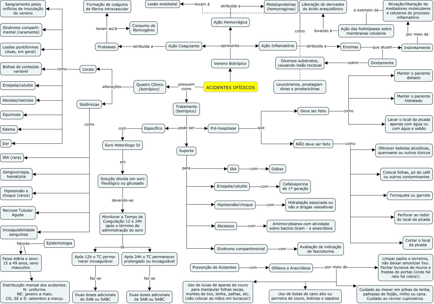 Esse mapa conceitual, produzido no IHMC CmapTools, tem a informação relacionada a: Acidentes Ofídicos - 4º caso, ACIDENTES OFÍDICOS possuem como Tratamento (botrópico), Locais como Equimose, Locais como Lesões puntiformes (duas, em geral), Suporte para Erisipela/celulite, Solução diluída em soro fisiológico ou glicosado devendo-se Monitorar o Tempo de Coagulação 12 e 24h após o término de administração do soro, Proteases levam ao/à Formação de coágulos de fibrina intravascular, Ofídeos e Aracnídeos por meio de Uso de luvas de aparas de couro para manipular folhas secas, montes de lixo, lenha, palhas, etc. (não colocar as mãos em buracos!), Tratamento (botrópico) pode ser Pré-hospitalar, Suporte para Síndrome compartimental, Ativação/liberação de mediadores moleculares e celulares do processo inflamatório a exemplo da Ação das fosfolipases sobre membranas celulares, Deve ser feito como Manter o paciente deitado, Enzimas que atuam Diretamente, Monitorar o Tempo de Coagulação 12 e 24h após o término de administração do soro se Após 24h o TC permanecer prolongado ou incoagulável, NÃO deve ser feito como Cortar o local da picada, Deve ser feito como Lavar o local da picada apenas com água ou com água e sabão, Epidemiologia fatores Faixa etária e sexo: 15 a 49 anos, sexo masculino, NÃO deve ser feito como Colocal folhas, pó de café ou outros contaminantes, Locais como Abcesso/necrose, Pré-hospitalar que NÃO deve ser feito, Deve ser feito como Manter o paciente hidratado