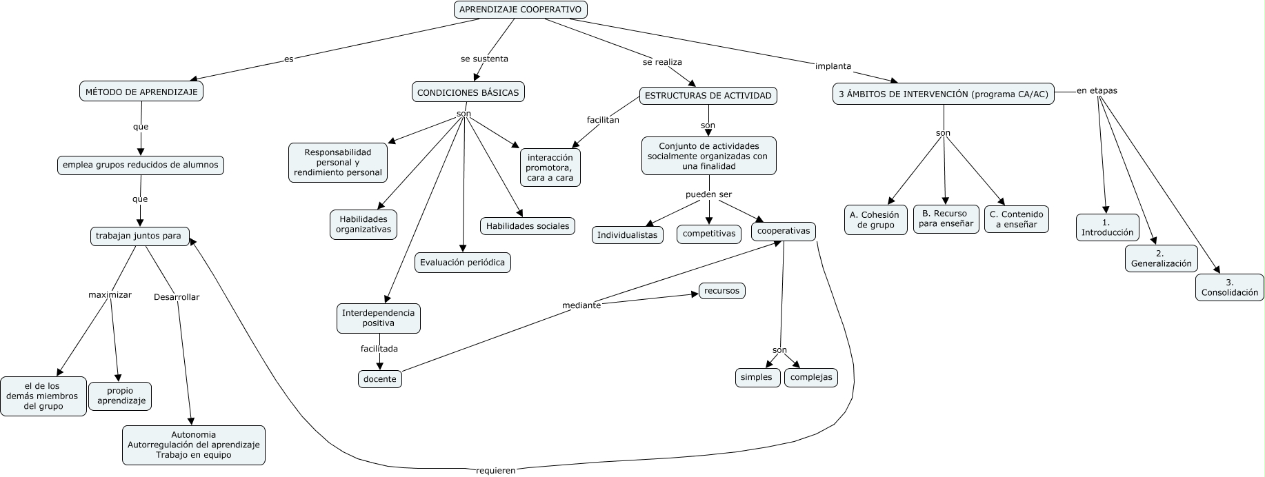 Este Cmap, tiene información relacionada con: Aprendizaje cooperativo, CONDICIONES BÁSICAS son Evaluación periódica, 3 ÁMBITOS DE INTERVENCIÓN (programa CA/AC) son B. Recurso para enseñar, Conjunto de actividades socialmente organizadas con una finalidad pueden ser cooperativas, ESTRUCTURAS DE ACTIVIDAD facilitan interacción promotora, cara a cara, CONDICIONES BÁSICAS son Habilidades sociales, APRENDIZAJE COOPERATIVO es MÉTODO DE APRENDIZAJE, docente mediante cooperativas, Interdependencia positiva facilitada docente, cooperativas son complejas, 3 ÁMBITOS DE INTERVENCIÓN (programa CA/AC) son C. Contenido a enseñar, 3 ÁMBITOS DE INTERVENCIÓN (programa CA/AC) son A. Cohesión de grupo, Conjunto de actividades socialmente organizadas con una finalidad pueden ser Individualistas, MÉTODO DE APRENDIZAJE que emplea grupos reducidos de alumnos, 3 ÁMBITOS DE INTERVENCIÓN (programa CA/AC) en etapas 1. Introducción, Conjunto de actividades socialmente organizadas con una finalidad pueden ser competitivas, CONDICIONES BÁSICAS son interacción promotora, cara a cara, emplea grupos reducidos de alumnos que trabajan juntos para, APRENDIZAJE COOPERATIVO se realiza ESTRUCTURAS DE ACTIVIDAD, APRENDIZAJE COOPERATIVO implanta 3 ÁMBITOS DE INTERVENCIÓN (programa CA/AC), APRENDIZAJE COOPERATIVO se sustenta CONDICIONES BÁSICAS