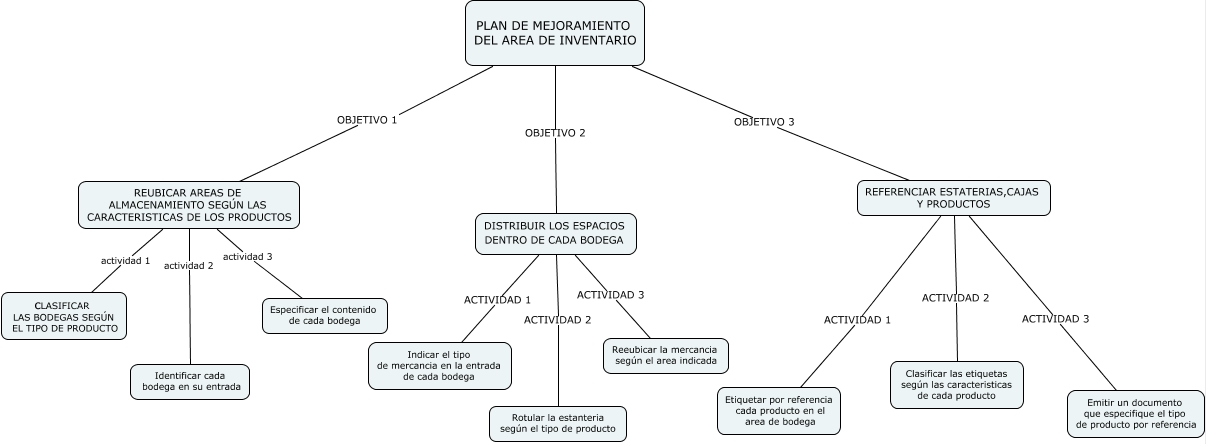 Este Cmap, tiene información relacionada con: MAPA CONCEPTUAL SOLUCION EN INVENTARIO, REFERENCIAR ESTATERIAS,CAJAS Y PRODUCTOS ACTIVIDAD 3 Emitir un documento que especifique el tipo de producto por referencia, DISTRIBUIR LOS ESPACIOS DENTRO DE CADA BODEGA ACTIVIDAD 2 Rotular la estanteria según el tipo de producto, REUBICAR AREAS DE ALMACENAMIENTO SEGÚN LAS CARACTERISTICAS DE LOS PRODUCTOS actividad 3 Especificar el contenido de cada bodega, DISTRIBUIR LOS ESPACIOS DENTRO DE CADA BODEGA ACTIVIDAD 1 Indicar el tipo de mercancia en la entrada de cada bodega, REFERENCIAR ESTATERIAS,CAJAS Y PRODUCTOS ACTIVIDAD 1 Etiquetar por referencia cada producto en el area de bodega, PLAN DE MEJORAMIENTO DEL AREA DE INVENTARIO OBJETIVO 3 REFERENCIAR ESTATERIAS,CAJAS Y PRODUCTOS, REUBICAR AREAS DE ALMACENAMIENTO SEGÚN LAS CARACTERISTICAS DE LOS PRODUCTOS actividad 2 Identificar cada bodega en su entrada, REFERENCIAR ESTATERIAS,CAJAS Y PRODUCTOS ACTIVIDAD 2 Clasificar las etiquetas según las caracteristicas de cada producto, PLAN DE MEJORAMIENTO DEL AREA DE INVENTARIO OBJETIVO 2 DISTRIBUIR LOS ESPACIOS DENTRO DE CADA BODEGA, DISTRIBUIR LOS ESPACIOS DENTRO DE CADA BODEGA ACTIVIDAD 3 Reeubicar la mercancia según el area indicada, PLAN DE MEJORAMIENTO DEL AREA DE INVENTARIO OBJETIVO 1 REUBICAR AREAS DE ALMACENAMIENTO SEGÚN LAS CARACTERISTICAS DE LOS PRODUCTOS, REUBICAR AREAS DE ALMACENAMIENTO SEGÚN LAS CARACTERISTICAS DE LOS PRODUCTOS actividad 1 cLASIFICAR LAS BODEGAS SEGÚN EL TIPO DE PRODUCTO