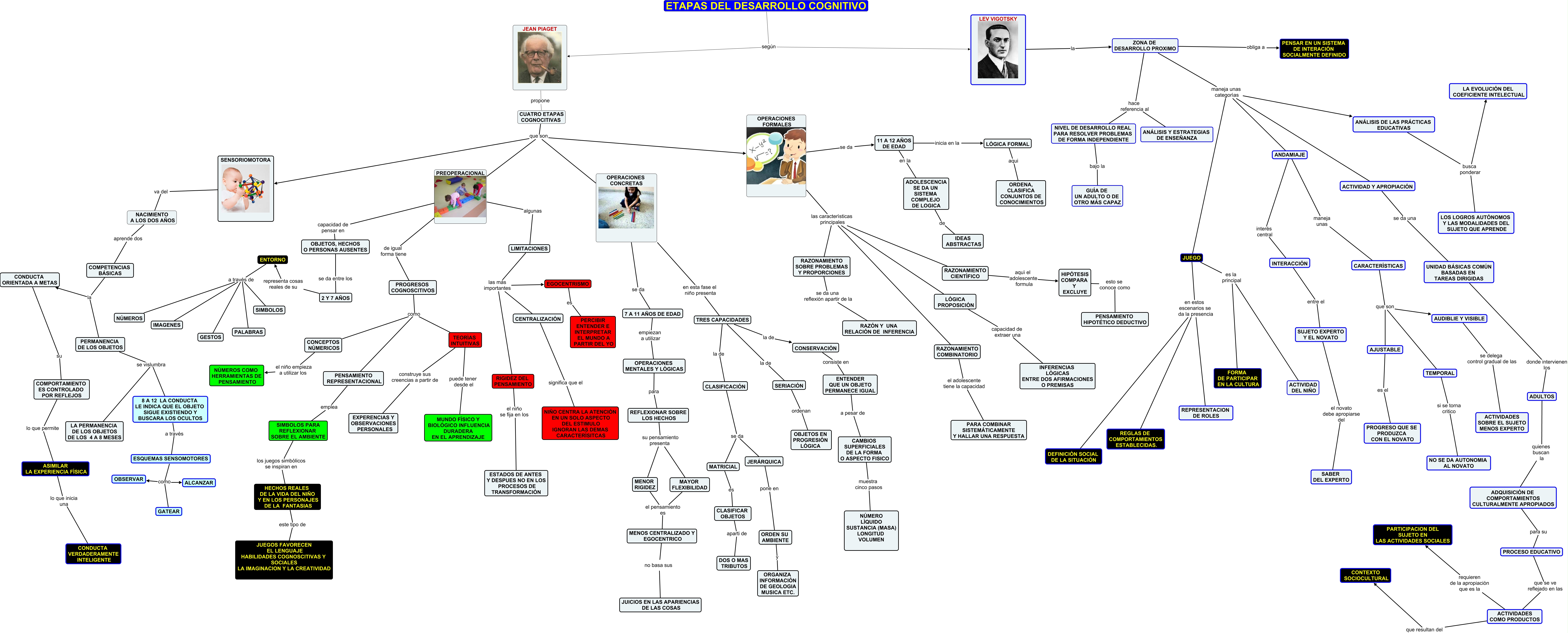 Este Cmap, tiene información relacionada con: ETAPAS DEL DESARROLLO COGNITIVO SEGUN PIAGET Y VIGOTSKY, ADOLESCENCIA SE DA UN SISTEMA COMPLEJO DE LOGICA de IDEAS ABSTRACTAS, ADULTOS quienes buscan la ADQUISICIÓN DE COMPORTAMIENTOS CULTURALMENTE APROPIADOS, JUEGO en estos escenarios se da la presencia DEFINICIÓN SOCIAL DE LA SITUACIÓN, CLASIFICACIÓN se da JERÁRQUICA, NACIMIENTO A LOS DOS AÑOS aprende dos COMPETENCIAS BÁSICAS, ANÁLISIS DE LAS PRÁCTICAS EDUCATIVAS busca ponderar LOS LOGROS AUTÓNOMOS Y LAS MODALIDADES DEL SUJETO QUE APRENDE, ESQUEMAS SENSOMOTORES como GATEAR, 2 Y 7 AÑOS representa cosas reales de su ENTORNO, ESQUEMAS SENSOMOTORES como ALCANZAR, RAZONAMIENTO COMBINATORIO el adolescente tiene la capacidad PARA COMBINAR SISTEMÁTICAMENTE Y HALLAR UNA RESPUESTA, PROGRESOS COGNOSCITIVOS como CONCEPTOS NÚMERICOS, CUATRO ETAPAS COGNOCITIVAS que son PREOPERACIONAL, UNIDAD BÁSICAS COMÚN BASADAS EN TAREAS DIRIGIDAS donde intervienen los ADULTOS, OPERACIONES CONCRETAS en esta fase el niño presenta TRES CAPACIDADES, MAYOR FLEXIBILIDAD el pensamiento es MENOS CENTRALIZADO Y EGOCENTRICO, ENTORNO a través de IMAGENES, CUATRO ETAPAS COGNOCITIVAS que son OPERACIONES FORMALES, ETAPAS DEL DESARROLLO COGNITIVO según JEAN PIAGET, ENTORNO a través de NÚMEROS, ZONA DE DESARROLLO PROXIMO hace referencia al ANÁLISIS Y ESTRATEGIAS DE ENSEÑANZA