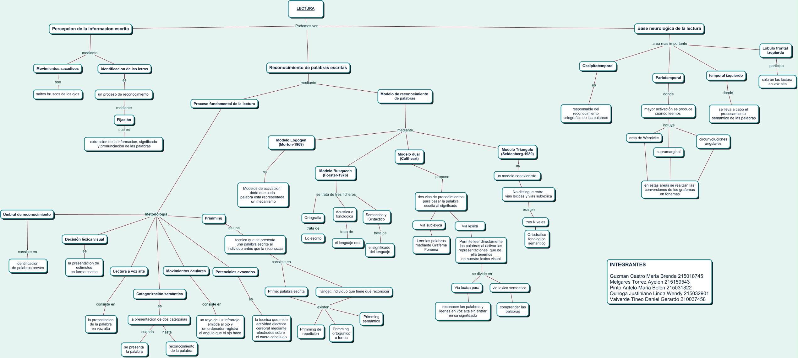 Este Cmap, tiene información relacionada con: lectura, tres Niveles ???? Ortodrafico fonologico semantico, temporal izquierdo donde se lleva a cabo el procesamiento semantico de las palabras, reconocer las palabras y leerlas en voz alta sin entrar en su significado ???? Via lexica pura, mayor activación se produce cuando leemos incluye supramarginal, Modelo dual (Caltheart) propone dos vias de procedimientos para pasar la palabra escrita al signifcado, Proceso fundamental de la lectura Metodologia Potenciales evocados, Categorización semántica es la presentacion de dos categorias, Prime: palabra escrita existen Tanget: individuo que tiene que reconocer, la presentacion de dos categorias hasta reconocimiento de la palabra, Decisión léxica visual es la presentacion de estimulos en forma escrita, Base neurologica de la lectura area mas importante Lobulo frontal izquierdo, Umbral de reconocimiento consiste en identificación de palabras breves, dos vias de procedimientos para pasar la palabra escrita al signifcado ???? Via sublexica, No distingue entre vias lexicas y vias sublexica existen tres Niveles, area de Wernicke ???? en estas areas se realizan las conversiones de los grafemas en fonemas, Primming es una tecnica que se presenta una palabra escrita al individuo antes que la reconozca, Proceso fundamental de la lectura Metodologia Lectura a voz alta, Proceso fundamental de la lectura Metodologia Movimientos oculares, Modelo de reconocimiento de palabras mediante Modelo Busqueda (Forster-1976), Percepcion de la informacion escrita mediante identificacion de las letras