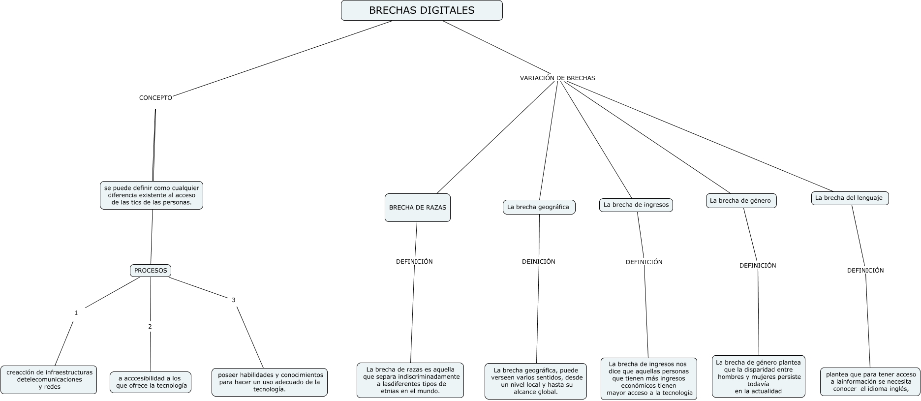 Este Cmap, tiene información relacionada con: BRECHAS DIGITALES, BRECHAS DIGITALES VARIACIÓN DE BRECHAS La brecha de género, La brecha geográfica DEINICIÓN La brecha geográfica, puede verseen varios sentidos, desde un nivel local y hasta su alcance global., BRECHA DE RAZAS DEFINICIÓN La brecha de razas es aquella que separa indiscriminadamente a lasdiferentes tipos de etnias en el mundo., PROCESOS 2 a acccesibilidad a los que ofrece la tecnología, BRECHAS DIGITALES VARIACIÓN DE BRECHAS La brecha de ingresos, BRECHAS DIGITALES VARIACIÓN DE BRECHAS La brecha del lenguaje, BRECHAS DIGITALES VARIACIÓN DE BRECHAS ????, La brecha del lenguaje DEFINICIÓN plantea que para tener acceso a lainformación se necesita conocer el idioma inglés,, BRECHAS DIGITALES CONCEPTO se puede definir como cualquier diferencia existente al acceso de las tics de las personas., PROCESOS 1 creacción de infraestructuras detelecomunicaciones y redes, PROCESOS 3 poseer habilidades y conocimientos para hacer un uso adecuado de la tecnología., BRECHAS DIGITALES CONCEPTO PROCESOS, La brecha de género DEFINICIÓN La brecha de género plantea que la disparidad entre hombres y mujeres persiste todavía en la actualidad, BRECHAS DIGITALES VARIACIÓN DE BRECHAS La brecha geográfica, La brecha de ingresos DEFINICIÓN La brecha de ingresos nos dice que aquellas personas que tienen más ingresos económicos tienen mayor acceso a la tecnología