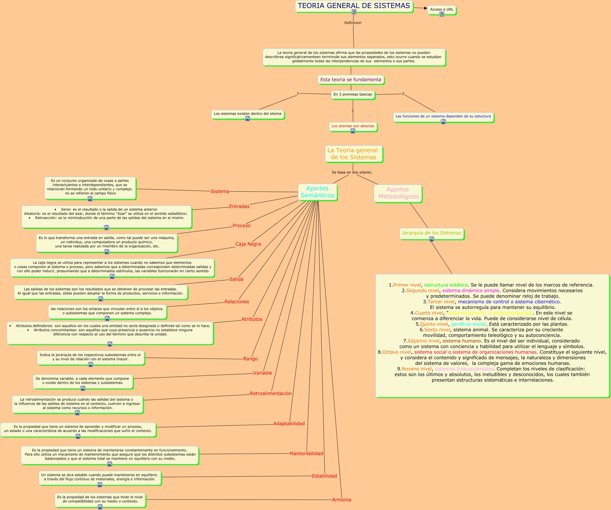 Este Cmap, tiene información relacionada con: clase_7.2018, TEORIA GENERAL DE SISTEMAS Definicion La teoria general de los sistemas afirma que las propiedades de los sistemas no pueden describirse significativamenteen terminode sus elementos separados, esto ocurre cuando se estudian globalmente todas las interpendencias de sus elementos o sus partes., Aportes Semánticos Atributos • Atributos definidores: son aquellos sin los cuales una entidad no sería designada o definida tal como se lo hace. • Atributos concomitantes: son aquellos que cuya presencia o ausencia no establece ninguna diferencia con respecto al uso del término que describe la unidad., Aportes Semánticos Adaptabilidad Es la propiedad que tiene un sistema de aprender y modificar un proceso, un estado o una característica de acuerdo a las modificaciones que sufre el contexto., Aportes Semánticos Relaciones las relaciones son los enlaces que vinculan entre sí a los objetos o subsistemas que componen un sistema complejo., TEORIA GENERAL DE SISTEMAS ???? Acceso a URL, Aportes Semánticos Retroalimentación La retroalimentación se produce cuando las salidas del sistema o la influencia de las salidas de sistema en el contexto, vuelven a ingresar al sistema como recursos o información., La Teoria general de los Sistemas Se basa en dos pilares: Aportes Semánticos, Aportes Semánticos Salida Las salidas de los sistemas son los resultados que se obtienen de procesar las entradas. Al igual que las entradas, éstas pueden adoptar la forma de productos, servicios e información., La Teoria general de los Sistemas Se basa en dos pilares: Aportes Metodológicos, Aportes Semánticos Estabilidad Un sistema se dice estable cuando puede mantenerse en equilibrio a través del flujo continuo de materiales, energía e información., Aportes Metodológicos ???? Jerarquía de los Sistemas, Esta teoria se fundamenta ???? En 3 premisas basicas, Aportes Semánticos Entradas • Serie: es el resultado o la salida de un sistema anterior Aleatoria: es el resultado del azar, donde el término "Azar" se utiliza en el sentido estadístico. • Retroacción: es la reintroducción de una parte de las salidas del sistema en sí mismo., Aportes Semánticos Mantenibilidad Es la propiedad que tiene un sistema de mantenerse constantemente en funcionamiento. Para ello utiliza un mecanismo de mantenimiento que asegure que los distintos subsistemas están balanceados y que el sistema total se mantiene en equilibrio con su medio., Aportes Semánticos Variable Se denomina variable, a cada elemento que compone o existe dentro de los sistemas y subsistemas., Aportes Semánticos Rango Indica la jerarquía de los respectivos subsistemas entre sí y su nivel de relación con el sistema mayor., Esta teoria se fundamenta ???? La teoria general de los sistemas afirma que las propiedades de los sistemas no pueden describirse significativamenteen terminode sus elementos separados, esto ocurre cuando se estudian globalmente todas las interpendencias de sus elementos o sus partes., Aportes Semánticos Sistema Es un conjunto organizado de cosas o partes interactuantes e interdependientes, que se relacionan formando un todo unitario y complejo. no se refieren al campo físico, En 3 premisas basicas 2 Los sitemas son abiertas, En 3 premisas basicas 1 Los sistemas existen dentro del sitema