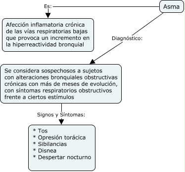 Este Cmap, tiene información relacionada con: Asma, Se considera sospechosos a sujetos con alteraciones bronquiales obstructivas crónicas con más de meses de evolución, con síntomas respiratorios obstructivos frente a ciertos estímulos Signos y Síntomas: * Tos * Opresión torácica * Sibilancias * Disnea * Despertar nocturno, Asma Diagnóstico: Se considera sospechosos a sujetos con alteraciones bronquiales obstructivas crónicas con más de meses de evolución, con síntomas respiratorios obstructivos frente a ciertos estímulos, Asma Es: Afección inflamatoria crónica de las vías respiratorias bajas que provoca un incremento en la hiperreactividad bronquial
