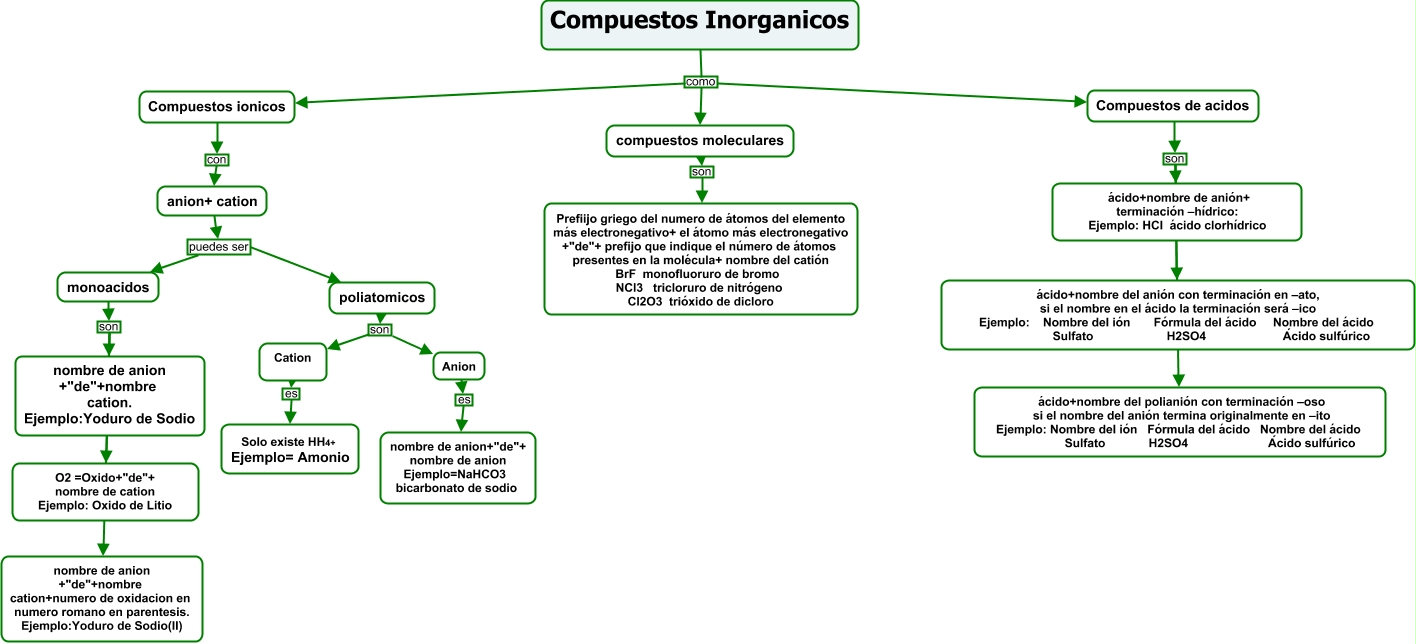 Este Cmap, tiene información relacionada con: Compuestos Inorganicos, monoacidos son nombre de anion +"de"+nombre cation. Ejemplo:Yoduro de Sodio, Compuestos Inorganicos como Compuestos ionicos, Anion es nombre de anion+"de"+ nombre de anion Ejemplo=NaHCO3 bicarbonato de sodio, monoacidos son nombre de anion +"de"+nombre cation+numero de oxidacion en numero romano en parentesis. Ejemplo:Yoduro de Sodio(II), monoacidos son O2 =Oxido+"de"+ nombre de cation Ejemplo: Oxido de Litio, Compuestos de acidos son ácido+nombre del polianión con terminación –oso si el nombre del anión termina originalmente en –ito Ejemplo: Nombre del ión Fórmula del ácido Nombre del ácido Sulfato H2SO4 Ácido sulfúrico, Compuestos de acidos son ácido+nombre de anión+ terminación –hídrico: Ejemplo: HCl ácido clorhídrico, anion+ cation puedes ser poliatomicos, anion+ cation puedes ser monoacidos, compuestos moleculares son Prefiijo griego del numero de átomos del elemento más electronegativo+ el átomo más electronegativo +"de"+ prefijo que indique el número de átomos presentes en la molécula+ nombre del catión BrF monofluoruro de bromo NCl3 tricloruro de nitrógeno Cl2O3 trióxido de dicloro, Compuestos Inorganicos como Compuestos de acidos, poliatomicos son Anion, Compuestos de acidos son ácido+nombre del anión con terminación en –ato, si el nombre en el ácido la terminación será –ico Ejemplo: Nombre del ión Fórmula del ácido Nombre del ácido Sulfato H2SO4 Ácido sulfúrico, Cation es Solo existe HH4+ Ejemplo= Amonio, Compuestos ionicos con anion+ cation, poliatomicos son Cation, Compuestos Inorganicos como compuestos moleculares