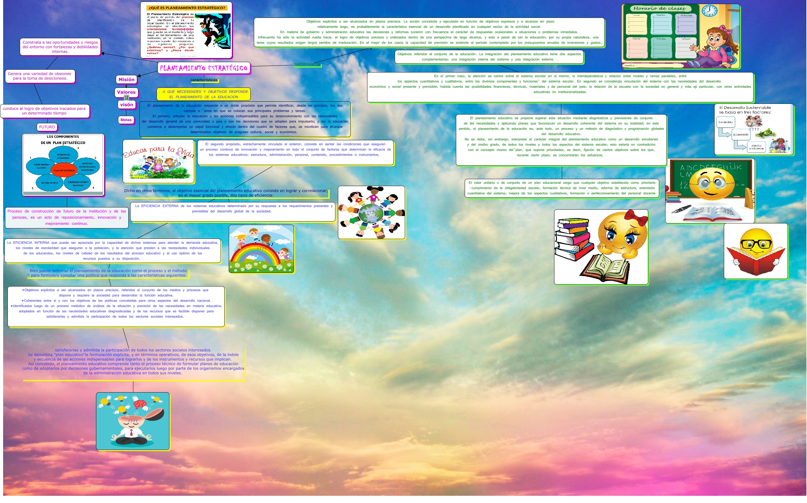 Este Cmap, tiene información relacionada con: Copia de Copia de planeamiento estrategico LILIAN JUÁREZ, PLANEAMIENTO ESTRATÉGICO características . A QUE NECESIDADES Y OBJETIVOS RESPONDE EL PLANEAMIENTO DE LA EDUCACION, Misión ???? visón, En el primer caso, la atención se centra sobre el sistema escolar en sí mismo, la interdependeiicia y relación entre niveles y ramas paralelas, entre los aspectos cuantitativos y cualitativos, entre los divérsos componentes y funciones" del sistema escolar. En segundo se consideraja vinculación del sisíema con las necesidades del desarrollo económico y socíal presente y previsible, habida cuenta las posibilidades financieras, técnicas, materiales y de personal del país; la relación de la escueía con la sociedad en general y más eji particular, con otras actividades educativas no institucionalizadas. ???? El planeamiento educativo se propone superar esta situación mediante diagnósticos y previsiones de conjunto de las necesidades y aplicando planes que favorezcan un desarrollo coherente del sistema en su totalidad; en este sentido, el planeamiento de la educación es, ante todo, un proceso y un método de diagnóstico y programación globales del desarrollo educativo. No se debe, sin embargo, interpretar el carácter integral del planeamiento educativo como un desarrollo simultaneo y del misího grado, de todos los niveles y todos los aspectos del sistema escolar; esto estaría en contradición con el concepto mismo del^plan, que supone prioridades, es decir, fijación de ciertos objetivos sobre los que, durante cierto plazo, se concentrarán los esfuerzos,, Objetivos explícitos a ser alcanzados en plazos precisos. La acción concebida y ejecutada en función de objetivos expresos y a alcanzar en plazo relativamente largo, es probablemente la característica esencial de un desarrollo planificado en cualquier sector de la actividad social. En materia de gobierno y administración educativa las decisiones y reformas tuvieron con frecuencia el carácter de respuestas ocasionales a situaciones o problemas inmediatos. Infrecuente ha sido la actividad vuelta hacia. el logro de objetivos precisos y ordenados dentro de una perspectiva de largo alcance, y esto a pesar de ser la educación, por su propia naturaleza, una tarea cuyos resultados exigen largos perídos de maduración. En el mejor de los casos la capacidad de previsión se extiende al período contemplado por los presupuestos anuales de inversiones y gastos. ???? En el primer caso, la atención se centra sobre el sistema escolar en sí mismo, la interdependeiicia y relación entre niveles y ramas paralelas, entre los aspectos cuantitativos y cualitativos, entre los divérsos componentes y funciones" del sistema escolar. En segundo se consideraja vinculación del sisíema con las necesidades del desarrollo económico y socíal presente y previsible, habida cuenta las posibilidades financieras, técnicas, materiales y de personal del país; la relación de la escueía con la sociedad en general y más eji particular, con otras actividades educativas no institucionalizadas., Misión ???? Valores, PLANEAMIENTO ESTRATÉGICO IMPORTANCIA Objetivos explícitos a ser alcanzados en plazos precisos. La acción concebida y ejecutada en función de objetivos expresos y a alcanzar en plazo relativamente largo, es probablemente la característica esencial de un desarrollo planificado en cualquier sector de la actividad social. En materia de gobierno y administración educativa las decisiones y reformas tuvieron con frecuencia el carácter de respuestas ocasionales a situaciones o problemas inmediatos. Infrecuente ha sido la actividad vuelta hacia. el logro de objetivos precisos y ordenados dentro de una perspectiva de largo alcance, y esto a pesar de ser la educación, por su propia naturaleza, una tarea cuyos resultados exigen largos perídos de maduración. En el mejor de los casos la capacidad de previsión se extiende al período contemplado por los presupuestos anuales de inversiones y gastos., Constrata a las oportunidades y riesgos del entorno con fortalezas y debilidades internas. ???? Genera una variedad de obsiones para la toma de desicionees., conduce al logro de objetivos trazados para un determinado tiempo ???? FUTURO, El segundo propósito, estrechamente vinculado al anterior, consiste en sentar las condiciones que aseguren un proceso continuo de innovación y mejoramiento en todo el conjunto de factores que determinan la eficacia de los sistemas educativos: estructura, administración, personal, contenido, procedimientos e instrumentos. Dicho en otros términos, el objetivo esencial del planeamiento educativo consiste en lograr y correlacionar, en el mayor grado posible, dos tipos de eficiencia: La EFICIENCIA EXTERNA de los sistemas educativos determinada por su respuesta a los requerimientos presentes y previsibles del desarrollo global de la sociedad;, PLANEAMIENTO ESTRATÉGICO Constrata a las oportunidades y riesgos del entorno con fortalezas y debilidades internas., El segundo propósito, estrechamente vinculado al anterior, consiste en sentar las condiciones que aseguren un proceso continuo de innovación y mejoramiento en todo el conjunto de factores que determinan la eficacia de los sistemas educativos: estructura, administración, personal, contenido, procedimientos e instrumentos. Dicho en otros términos, el objetivo esencial del planeamiento educativo consiste en lograr y correlacionar, en el mayor grado posible, dos tipos de eficiencia: La EFICIENCIA INTERNA que puede ser apreciada por la capacidad de dichos sistemas para atender la demanda educativa, los niveles de escolaridad que aseguran a la población, y la atención que presten a las necesidades indivividuales de los educandos, los niveles de calidad de los resultados del proceso educativo y el uso óptimo de los recursos puestos a su disposición., El planeamiento educativo se propone superar esta situación medi