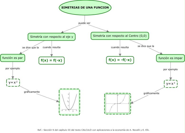 Este Cmap, tiene información relacionada con: SIMETRIAS DE UNA FUNCION, Simetría con respecto al Centro (0,0) cuando resulta f(x) = -f(-x), Simetría con respecto al eje y cuando resulta f(x) = f(-x), función es impar por ejemplo <math xmlns="http://www.w3.org/1998/Math/MathML"> <mrow> <mtext> y= </mtext> <mmultiscripts> <mtext> x </mtext> <none/> <mtext> 3 </mtext> </mmultiscripts> </mrow> </math>, SIMETRIAS DE UNA FUNCION puede ser Simetría con respecto al eje y, <math xmlns="http://www.w3.org/1998/Math/MathML"> <mrow> <mtext> y= </mtext> <mmultiscripts> <mtext> x </mtext> <none/> <mtext> 3 </mtext> </mmultiscripts> </mrow> </math> gráficamente, SIMETRIAS DE UNA FUNCION puede ser Simetría con respecto al Centro (0,0), función es par por ejemplo <math xmlns="http://www.w3.org/1998/Math/MathML"> <mrow> <mtext> y= </mtext> <mmultiscripts> <mtext> x </mtext> <none/> <mtext> 2 </mtext> </mmultiscripts> </mrow> </math>, Simetría con respecto al Centro (0,0) se dice que la función es impar, Simetría con respecto al eje y se dice que la función es par, <math xmlns="http://www.w3.org/1998/Math/MathML"> <mrow> <mtext> y= </mtext> <mmultiscripts> <mtext> x </mtext> <none/> <mtext> 2 </mtext> </mmultiscripts> </mrow> </math> gráficamente