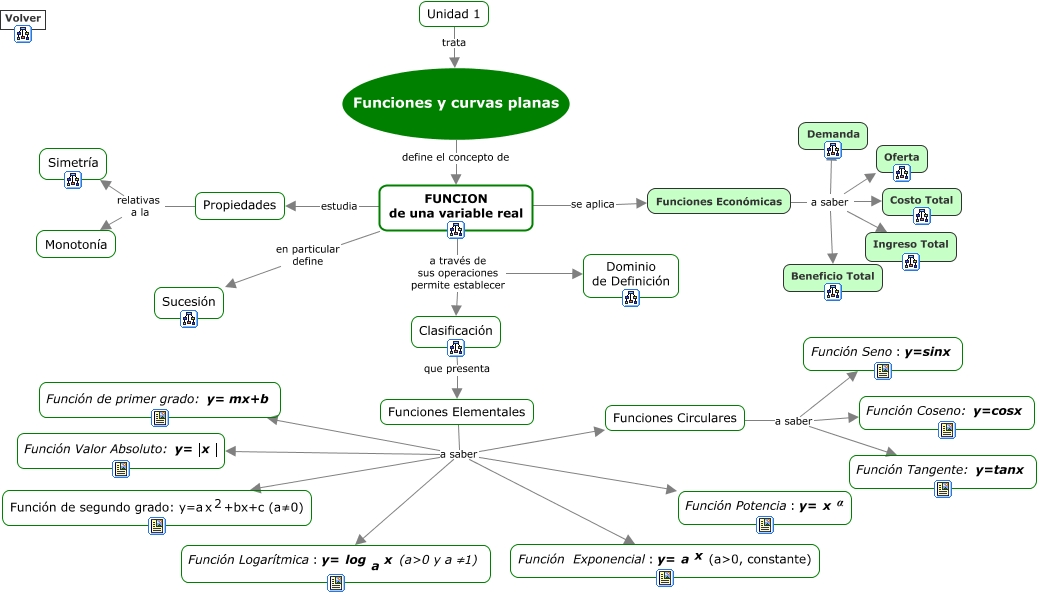 Este Cmap, tiene información relacionada con: UNIDAD 1 FUNCIONES Y CURVAS PLANAS, Funciones Elementales a saber <math xmlns="http://www.w3.org/1998/Math/MathML"> <mrow> <mtext> Función Potencia: y= </mtext> <mmultiscripts> <mtext> x </mtext> <none/> <mtext> α </mtext> </mmultiscripts> </mrow> </math>, FUNCION de una variable real a través de sus operaciones permite establecer Dominio de Definición, Clasificación que presenta Funciones Elementales, Funciones Elementales a saber <math xmlns="http://www.w3.org/1998/Math/MathML"> <mrow> <mtext> Función de segundo grado: y=a </mtext> <mmultiscripts> <mtext> x </mtext> <none/> <mtext> 2 </mtext> </mmultiscripts> <mtext> +bx+c (a≠0) </mtext> </mrow> </math>, Funciones Económicas a saber Ingreso Total, Funciones Circulares a saber Función Seno: y=sinx, FUNCION de una variable real estudia Propiedades, Funciones Elementales a saber <math xmlns="http://www.w3.org/1998/Math/MathML"> <mrow> <mtext> Función Logarítmica: y= </mtext> <mmultiscripts> <mtext> log </mtext> <mtext> a </mtext> <none/> </mmultiscripts> <mtext> x (a>0 y a≠1) </mtext> </mrow> </math>, Funciones y curvas planas define el concepto de FUNCION de una variable real, Funciones Elementales a saber <math xmlns="http://www.w3.org/1998/Math/MathML"> <mrow> <mtext> Función Valor Absoluto: y= </mtext> <mfenced open="|" close="|"> <mtext> x </mtext> </mfenced> </mrow> </math>, FUNCION de una variable real se aplica Funciones Económicas, Funciones Económicas a saber Beneficio Total, Funciones Económicas a saber Costo Total, Funciones Circulares a saber Función Tangente: y=tanx, Unidad 1 trata Funciones y curvas planas, FUNCION de una variable real en particular define Sucesión, Funciones Elementales a saber <math xmlns="http://www.w3.org/1998/Math/MathML"> <mrow> <mtext> Función Exponencial: y= </mtext> <mmultiscripts> <mtext> a </mtext> <none/> <mtext> x </mtext> </mmultiscripts> <mtext> (a>0, constante) </mtext> </mrow> </math>, FUNCION de una variable real a través de sus operaciones permite establecer Clasificación, Funciones Elementales a saber Función de primer grado: y= mx+b, Funciones Económicas a saber Oferta