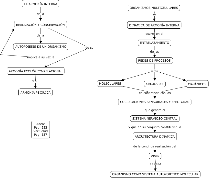 Este Cmap, tiene información relacionada con: Armonía. Su triple dimensión, CORRELACIONES SENSORIALES Y EFECTORAS que genera el SISTEMA NERVIOSO CENTRAL, DINÁMICA DE ARMONÍA INTERNA ocurre en el ENTRELAZAMIENTO, REDES DE PROCESOS tanto ORGÁNICOS, MOLECULARES en coherencia con las CORRELACIONES SENSORIALES Y EFECTORAS, REDES DE PROCESOS tanto MOLECULARES, LA ARMONÍA INTERNA de la REALIZACIÓN Y CONSERVACIÓN, CELULARES en coherencia con las CORRELACIONES SENSORIALES Y EFECTORAS, ENTRELAZAMIENTO de las REDES DE PROCESOS, SISTEMA NERVIOSO CENTRAL y que en su conjunto constituyen la ARQUITECTURA DINÁMICA, REDES DE PROCESOS tanto CELULARES, REALIZACIÓN Y CONSERVACIÓN de su ARMONÍA ECOLÓGICO-RELACIONAL, ORGANISMOS MULTICELULARES su DINÁMICA DE ARMONÍA INTERNA, ARMONÍA ECOLÓGICO-RELACIONAL y su ARMONÍA PSÍQUICA, AUTOPOIESIS DE UN ORGANISMO implica a su vez la REALIZACIÓN Y CONSERVACIÓN, ARQUITECTURA DINÁMICA de la continua realización del VIVIR, ORGÁNICOS en coherencia con las CORRELACIONES SENSORIALES Y EFECTORAS, VIVIR de cada ORGANISMO COMO SISTEMA AUTOPOIETICO MOLECULAR, REALIZACIÓN Y CONSERVACIÓN de la AUTOPOIESIS DE UN ORGANISMO