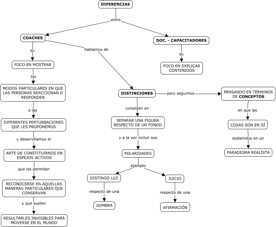 Este Cmap, tiene información relacionada con: Diferencias entre coach y capacitador, POLARIDADES ejemplo JUICIO, FOCO EN MOSTRAR los MODOS PARTICULARES EN QUE LAS PERSONAS REACCIONAN O RESPONDEN, DOC. - CAPACITADORES su FOCO EN EXPLICAR CONTENIDOS, MODOS PARTICULARES EN QUE LAS PERSONAS REACCIONAN O RESPONDEN a las DIFERENTES PERTURBACIONES QUE LES PROPONEMOS, JUICIO respecto de una AFIRMACIÓN, SEPARAR UNA FIGURA RESPECTO DE UN FONDO y a la vez incluir sus POLARIDADES, PENSANDO EN TÉRMINOS DE CONCEPTOS en que las COSAS SON EN SÍ, DIFERENTES PERTURBACIONES QUE LES PROPONEMOS y desarrollamos el ARTE DE CONSTITUIRNOS EN ESPEJOS ACTIVOS, DISTINCIONES consisten en SEPARAR UNA FIGURA RESPECTO DE UN FONDO, POLARIDADES ejemplo DISTINGO LUZ, COSAS SON EN SÍ sostenidos en un PARADIGMA REALISTA, DIFERENCIAS entre COACHES, DIFERENCIAS entre DOC. - CAPACITADORES, DISTINGO LUZ respecto de una SOMBRA, COACHES hablamos de DISTINCIONES, ARTE DE CONSTITUIRNOS EN ESPEJOS ACTIVOS que les permitan RECONOCERSE EN AQUELLAS MANERAS PARTICULARES QUE CONSERVAN, DISTINCIONES pero seguimos PENSANDO EN TÉRMINOS DE CONCEPTOS, RECONOCERSE EN AQUELLAS MANERAS PARTICULARES QUE CONSERVAN y que suelen RESULTARLES INVISIBLES PARA MOVERSE EN EL MUNDO, COACHES su FOCO EN MOSTRAR