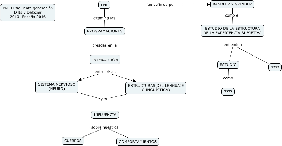 Este Cmap, tiene información relacionada con: PNL DILTS Y DELOZIER, INFLUENCIA sobre nuestros CUERPOS, BANDLER Y GRINDER como el ESTUDIO DE LA ESTRUCTURA DE LA EXPERIENCIA SUBJETIVA, ESTUDIO DE LA ESTRUCTURA DE LA EXPERIENCIA SUBJETIVA entienden ????, ESTRUCTURAS DEL LENGUAJE (LINGUÍSTICA) y su INFLUENCIA, ESTUDIO como ????, PNL examina las PROGRAMACIONES, INTERACCIÓN entre el/las ESTRUCTURAS DEL LENGUAJE (LINGUÍSTICA), INFLUENCIA sobre nuestros COMPORTAMIENTOS, PNL fue definida por BANDLER Y GRINDER, INTERACCIÓN entre el/las SISTEMA NERVIOSO (NEURO), PROGRAMACIONES creadas en la INTERACCIÓN, SISTEMA NERVIOSO (NEURO) y su INFLUENCIA, ESTUDIO DE LA ESTRUCTURA DE LA EXPERIENCIA SUBJETIVA entienden ESTUDIO
