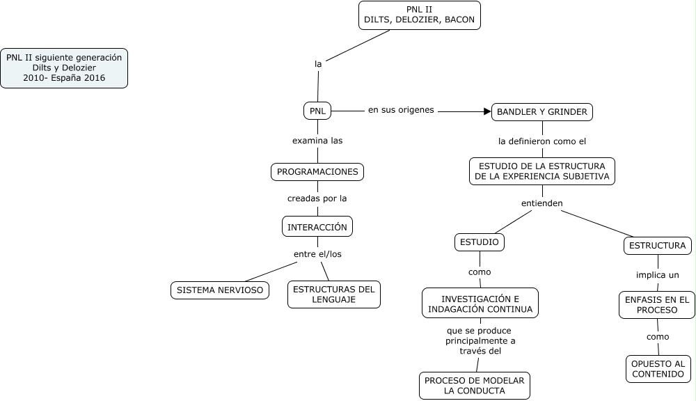 Este Cmap, tiene información relacionada con: PNL DILTS Y DELOZIER 2, ESTUDIO DE LA ESTRUCTURA DE LA EXPERIENCIA SUBJETIVA entienden ESTUDIO, INTERACCIÓN entre el/los ESTRUCTURAS DEL LENGUAJE, PNL examina las PROGRAMACIONES, INVESTIGACIÓN E INDAGACIÓN CONTINUA que se produce principalmente a través del PROCESO DE MODELAR LA CONDUCTA, INTERACCIÓN entre el/los SISTEMA NERVIOSO, PNL en sus origenes BANDLER Y GRINDER, ENFASIS EN EL PROCESO como OPUESTO AL CONTENIDO, ESTRUCTURA implica un ENFASIS EN EL PROCESO, PROGRAMACIONES creadas por la INTERACCIÓN, ESTUDIO DE LA ESTRUCTURA DE LA EXPERIENCIA SUBJETIVA entienden ESTRUCTURA, ESTUDIO como INVESTIGACIÓN E INDAGACIÓN CONTINUA, PNL II DILTS, DELOZIER, BACON la PNL, BANDLER Y GRINDER la definieron como el ESTUDIO DE LA ESTRUCTURA DE LA EXPERIENCIA SUBJETIVA