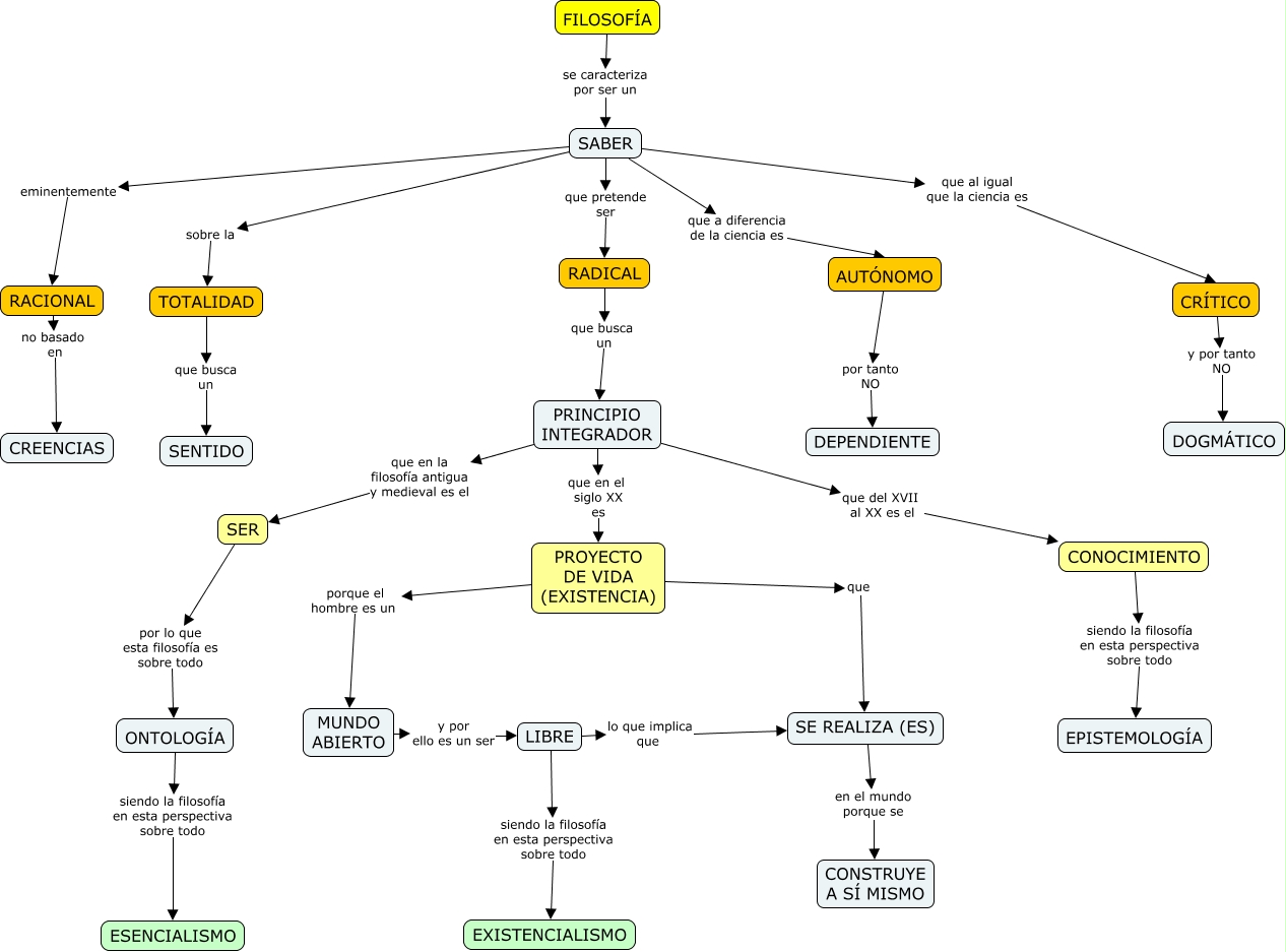 Este Cmap, tiene información relacionada con: UD1 Qué es la Filosofía, SABER que al igual que la ciencia es CRÍTICO, SABER que pretende ser RADICAL, ONTOLOGÍA siendo la filosofía en esta perspectiva sobre todo ESENCIALISMO, FILOSOFÍA se caracteriza por ser un SABER, LIBRE lo que implica que SE REALIZA (ES), SABER sobre la TOTALIDAD, AUTÓNOMO por tanto NO DEPENDIENTE, MUNDO ABIERTO y por ello es un ser LIBRE, SE REALIZA (ES) en el mundo porque se CONSTRUYE A SÍ MISMO, CRÍTICO y por tanto NO DOGMÁTICO, TOTALIDAD que busca un SENTIDO, RACIONAL no basado en CREENCIAS, SABER eminentemente RACIONAL, CONOCIMIENTO siendo la filosofía en esta perspectiva sobre todo EPISTEMOLOGÍA, LIBRE siendo la filosofía en esta perspectiva sobre todo EXISTENCIALISMO, SER por lo que esta filosofía es sobre todo ONTOLOGÍA, PRINCIPIO INTEGRADOR que del XVII al XX es el CONOCIMIENTO, SABER que a diferencia de la ciencia es AUTÓNOMO, PROYECTO DE VIDA (EXISTENCIA) que SE REALIZA (ES), PRINCIPIO INTEGRADOR que en el siglo XX es PROYECTO DE VIDA (EXISTENCIA)