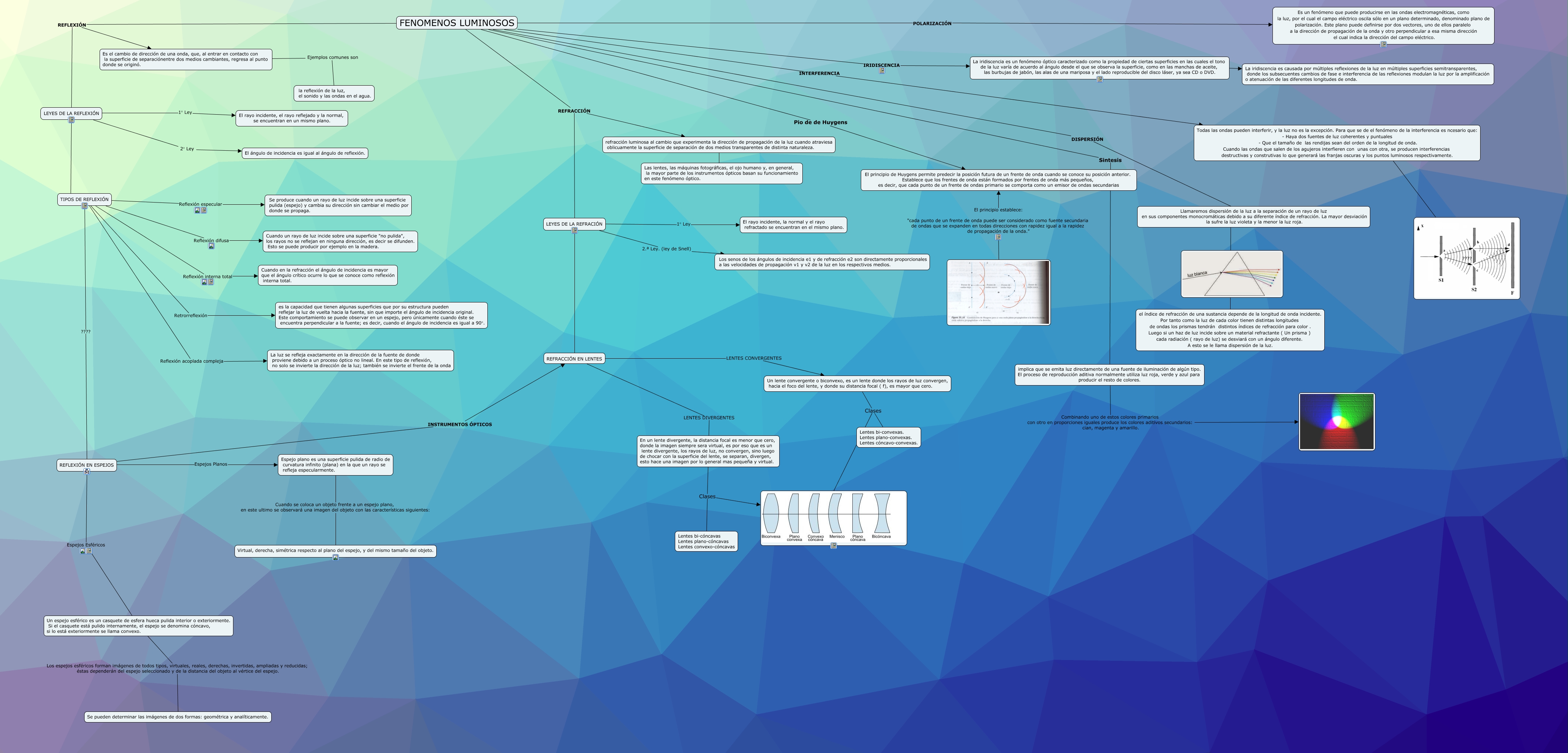 Este Cmap, tiene información relacionada con: FENOMENOS LUMINOSOS, FENOMENOS LUMINOSOS Sintesis implica que se emita luz directamente de una fuente de iluminación de algún tipo. El proceso de reproducción aditiva normalmente utiliza luz roja, verde y azul para producir el resto de colores., LEYES DE LA REFLEXIÓN 1° Ley El rayo incidente, el rayo reflejado y la normal, se encuentran en un mismo plano., Un lente convergente o biconvexo, es un lente donde los rayos de luz convergen, hacia el foco del lente, y donde su distancia focal ( f), es mayor que cero. Clases Lentes bi-convexas. Lentes plano-convexas. Lentes cóncavo-convexas., Llamaremos dispersión de la luz a la separación de un rayo de luz en sus componentes monocromáticas debido a su diferente índice de refracción. La mayor desviación la sufre la luz violeta y la menor la luz roja. ???? el índice de refracción de una sustancia depende de la longitud de onda incidente. Por tanto como la luz de cada color tienen distintas longitudes de ondas los prismas tendrán distintos índices de refracción para color . Luego si un haz de luz incide sobre un material refractante ( Un prisma ) cada radiación ( rayo de luz) se desviará con un ángulo diferente. A esto se le llama dispersión de la luz., REFRACCIÓN EN LENTES LENTES CONVERGENTES Un lente convergente o biconvexo, es un lente donde los rayos de luz convergen, hacia el foco del lente, y donde su distancia focal ( f), es mayor que cero., TIPOS DE REFLEXIÓN Retrorreflexión es la capacidad que tienen algunas superficies que por su estructura pueden reflejar la luz de vuelta hacia la fuente, sin que importe el ángulo de incidencia original. Este comportamiento se puede observar en un espejo, pero únicamente cuando éste se encuentra perpendicular a la fuente; es decir, cuando el ángulo de incidencia es igual a 90°., FENOMENOS LUMINOSOS REFRACCIÓN LEYES DE LA REFRACIÓN, LEYES DE LA REFRACIÓN 1° Ley El rayo incidente, la normal y el rayo refractado se encuentran en el mismo plano., FENOMENOS LUMINOSOS REFLEXIÓN LEYES DE LA REFLEXIÓN, REFLEXIÓN EN ESPEJOS Espejos Esféricos Un espejo esférico es un casquete de esfera hueca pulida interior o exteriormente. Si el casquete está pulido internamente, el espejo se denomina cóncavo, si lo está exteriormente se llama convexo., LEYES DE LA REFRACIÓN 2.ª Ley. (ley de Snell) Los senos de los ángulos de incidencia e1 y de refracción e2 son directamente proporcionales a las velocidades de propagación v1 y v2 de la luz en los respectivos medios., TIPOS DE REFLEXIÓN Reflexión especular Se produce cuando un rayo de luz incide sobre una superficie pulida (espejo) y cambia su dirección sin cambiar el medio por donde se propaga., LEYES DE LA REFLEXIÓN ???? TIPOS DE REFLEXIÓN, TIPOS DE REFLEXIÓN Reflexión difusa Cuando un rayo de luz incide sobre una superficie "no pulida", los rayos no se reflejan en ninguna dirección, es decir se difunden. Esto se puede producir por ejemplo en la madera., TIPOS DE REFLEXIÓN Reflexión acoplada compleja La luz se refleja exactamente en la dirección de la fuente de donde proviene debido a un proceso óptico no lineal. En este tipo de reflexión, no solo se invierte la dirección de la luz; también se invierte el frente de la onda, FENOMENOS LUMINOSOS REFLEXIÓN Es el cambio de dirección de una onda, que, al entrar en contacto con la superficie de separaciónentre dos medios cambiantes, regresa al punto donde se originó., Un espejo esférico es un casquete de esfera hueca pulida interior o exteriormente. Si el casquete está pulido internamente, el espejo se denomina cóncavo, si lo está exteriormente se llama convexo. Los espejos esféricos forman imágenes de todos tipos, virtuales, reales, derechas, invertidas, ampliadas y reducidas; éstas dependerán del espejo seleccionado y de la distancia del objeto al vértice del espejo. Se pueden determinar las imágenes de dos formas: geométrica y analíticamente., TIPOS DE REFLEXIÓN ???? REFLEXIÓN EN ESPEJOS, FENOMENOS LUMINOSOS Pio de de Huygens El principio de Huygens permite predecir la posición futura de un frente de onda cuando se conoce su posición anterior. Establece que los frentes de onda están formados por frentes de onda más pequeños, es decir, que cada punto de un frente de ondas primario se comporta como un emisor de ondas secundarias, Todas las ondas pueden interferir, y la luz no es la excepción. Para que se de el fenómeno de la interferencia es ncesario que: - Haya dos fuentes de luz coherentes y puntuales - Que el tamaño de las rendijas sean del orden de la longitud de onda. Cuando las ondas que salen de los agujeros interfieren con unas con otra, se producen interferencias destructivas y construtivas lo que generará las franjas oscuras y los puntos luminosos respectivamente. ???? ????
