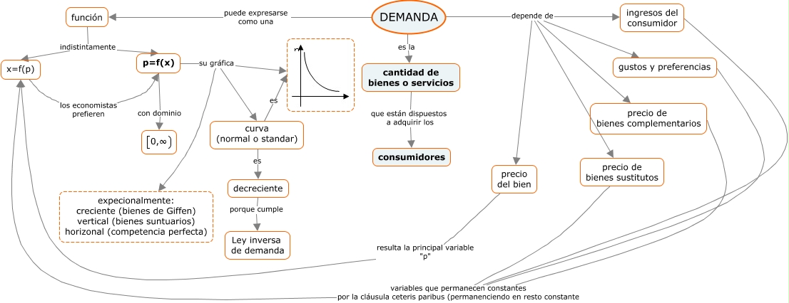 Este Cmap, tiene información relacionada con: DEMANDA, curva (normal o standar) es, gustos y preferencias variables que permanecen constantes por la cláusula ceteris paribus (permanenciendo en resto constante x=f(p), decreciente porque cumple Ley inversa de demanda, x=f(p) los economistas prefieren p=f(x), ingresos del consumidor variables que permanecen constantes por la cláusula ceteris paribus (permanenciendo en resto constante x=f(p), p=f(x) su gráfica expecionalmente: creciente (bienes de Giffen) vertical (bienes suntuarios) horizonal (competencia perfecta), p=f(x) con dominio <math xmlns="http://www.w3.org/1998/Math/MathML"> <mfenced open="[" close=")"> <mtext> 0,∞ </mtext> </mfenced> </math>, DEMANDA depende de ingresos del consumidor, cantidad de bienes o servicios que están dispuestos a adquirir los consumidores, DEMANDA depende de precio de bienes sustitutos, precio de bienes sustitutos variables que permanecen constantes por la cláusula ceteris paribus (permanenciendo en resto constante x=f(p), curva (normal o standar) es decreciente, función indistintamente x=f(p), DEMANDA puede expresarse como una función, DEMANDA depende de gustos y preferencias, función indistintamente p=f(x), precio de bienes complementarios variables que permanecen constantes por la cláusula ceteris paribus (permanenciendo en resto constante x=f(p), precio del bien resulta la principal variable "p" x=f(p), DEMANDA es la cantidad de bienes o servicios, DEMANDA depende de precio del bien