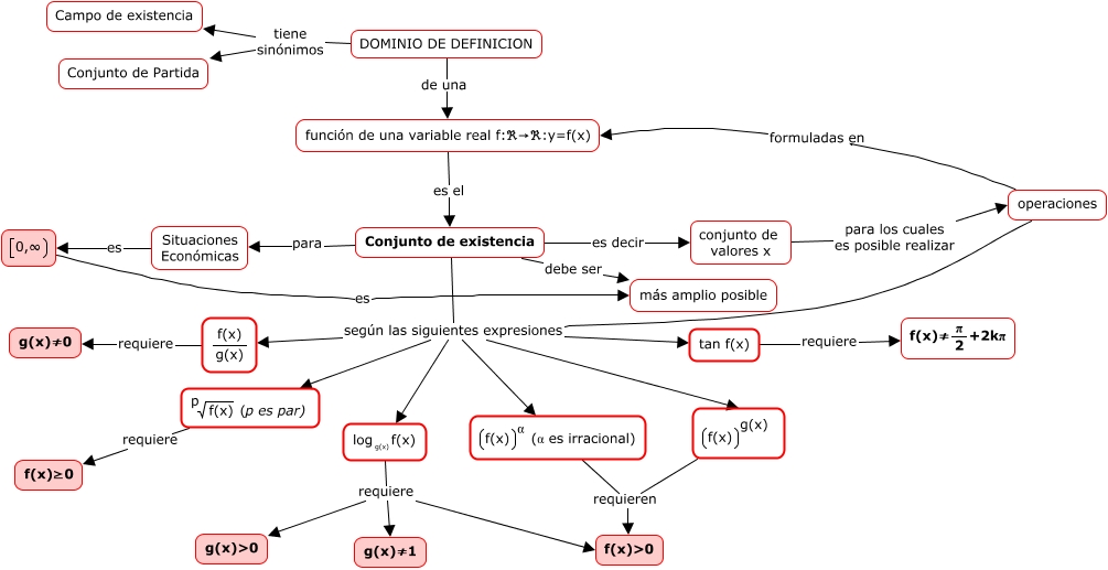 Este Cmap, tiene información relacionada con: Dominio de definición, operaciones formuladas en función de una variable real f:ℜ→ℜ:y=f(x), DOMINIO DE DEFINICION tiene sinónimos Campo de existencia, <math xmlns="http://www.w3.org/1998/Math/MathML"> <mrow> <mfenced open="[" close=")"> <mtext> 0,∞ </mtext> </mfenced> </mrow> </math> es más amplio posible, <math xmlns="http://www.w3.org/1998/Math/MathML"> <mrow> <mroot> <mtext> f(x) </mtext> <mtext> p </mtext> </mroot> <mtext> (p es par) </mtext> </mrow> </math> requiere f(x)≥0, <math xmlns="http://www.w3.org/1998/Math/MathML"> <mrow> <mmultiscripts> <mtext> log </mtext> <mtext> g(x) </mtext> <none/> </mmultiscripts> <mtext> f(x) </mtext> </mrow> </math> requiere f(x)ɬ, Situaciones Económicas es <math xmlns="http://www.w3.org/1998/Math/MathML"> <mrow> <mfenced open="[" close=")"> <mtext> 0,∞ </mtext> </mfenced> </mrow> </math>, operaciones según las siguientes expresiones <math xmlns="http://www.w3.org/1998/Math/MathML"> <mmultiscripts> <mrow> <mfenced open="(" close=")"> <mtext> f(x) </mtext> </mfenced> </mrow> <none/> <mtext> α </mtext> </mmultiscripts> <mtext> (α es irracional) </mtext> </math>, Conjunto de existencia es decir conjunto de valores x, <math xmlns="http://www.w3.org/1998/Math/MathML"> <mrow> <mmultiscripts> <mtext> log </mtext> <mtext> g(x) </mtext> <none/> </mmultiscripts> <mtext> f(x) </mtext> </mrow> </math> requiere g(x)ɬ, <math xmlns="http://www.w3.org/1998/Math/MathML"> <mmultiscripts> <mrow> <mfenced open="(" close=")"> <mtext> f(x) </mtext> </mfenced> </mrow> <none/> <mtext> g(x) </mtext> </mmultiscripts> <mtext> </mtext> </math> requieren f(x)ɬ, tan f(x) requiere <math xmlns="http://www.w3.org/1998/Math/MathML"> <mrow> <mtext> f(x)≠ </mtext> <mfrac> <mtext> π </mtext> <mtext> 2 </mtext> </mfrac> <mtext> +2kπ </mtext> </mrow> </math>, Conjunto de existencia según las siguientes expresiones <math xmlns="http://www.w3.org/1998/Math/MathML"> <mrow> <mmultiscripts> <mtext> log </mtext> <mtext> g(x) </mtext> <none/> </mmultiscripts> <mtext> f(x) </mtext> </mrow> </math>, <math xmlns="http://www.w3.org/1998/Math/MathML"> <mrow> <mmultiscripts> <mtext> log </mtext> <mtext> g(x) </mtext> <none/> </mmultiscripts> <mtext> f(x) </mtext> </mrow> </math> requiere g(x)≠1, Conjunto de existencia según las siguientes expresiones <math xmlns="http://www.w3.org/1998/Math/MathML"> <mmultiscripts> <mrow> <mfenced open="(" close=")"> <mtext> f(x) </mtext> </mfenced> </mrow> <none/> <mtext> α </mtext> </mmultiscripts> <mtext> (α es irracional) </mtext> </math>, Conjunto de existencia según las siguientes expresiones <math xmlns="http://www.w3.org/1998/Math/MathML"> <mrow> <mroot> <mtext> f(x) </mtext> <mtext> p </mtext> </mroot> <mtext> (p es par) </mtext> </mrow> </math>, operaciones según las siguientes expresiones <math xmlns="http://www.w3.org/1998/Math/MathML"> <mrow> <mroot> <mtext> f(x) </mtext> <mtext> p </mtext> </mroot> <mtext> (p es par) </mtext> </mrow> </math>, Conjunto de existencia debe ser más amplio posible, Conjunto de existencia según las siguientes expresiones tan f(x), <math xmlns="http://www.w3.org/1998/Math/MathML"> <mrow> <mfrac> <mtext> f(x) </mtext> <mtext> g(x) </mtext> </mfrac> </mrow> </math> requiere g(x)≠0, DOMINIO DE DEFINICION tiene sinónimos Conjunto de Partida