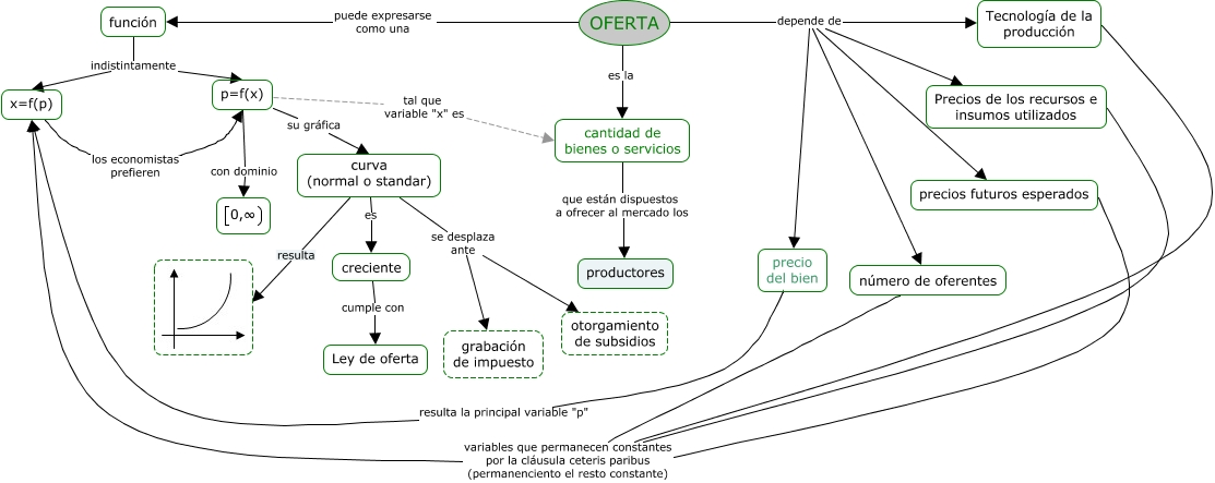 Este Cmap, tiene información relacionada con: OFERTA, función indistintamente p=f(x), curva (normal o standar) resulta, p=f(x) su gráfica curva (normal o standar), OFERTA depende de número de oferentes, OFERTA es la cantidad de bienes o servicios, curva (normal o standar) se desplaza ante otorgamiento de subsidios, OFERTA depende de precios futuros esperados, número de oferentes variables que permanecen constantes por la cláusula ceteris paribus (permanenciento el resto constante) x=f(p), p=f(x) con dominio <math xmlns="http://www.w3.org/1998/Math/MathML"> <mfenced open="[" close=")"> <mtext> 0,∞ </mtext> </mfenced> </math>, Tecnología de la producción variables que permanecen constantes por la cláusula ceteris paribus (permanenciento el resto constante) x=f(p), precios futuros esperados variables que permanecen constantes por la cláusula ceteris paribus (permanenciento el resto constante) x=f(p), función indistintamente x=f(p), precio del bien resulta la principal variable "p" x=f(p), OFERTA depende de Precios de los recursos e insumos utilizados, OFERTA depende de Tecnología de la producción, OFERTA depende de precio del bien, curva (normal o standar) se desplaza ante grabación de impuesto, Precios de los recursos e insumos utilizados variables que permanecen constantes por la cláusula ceteris paribus (permanenciento el resto constante) x=f(p), OFERTA puede expresarse como una función, p=f(x) tal que variable "x" es cantidad de bienes o servicios