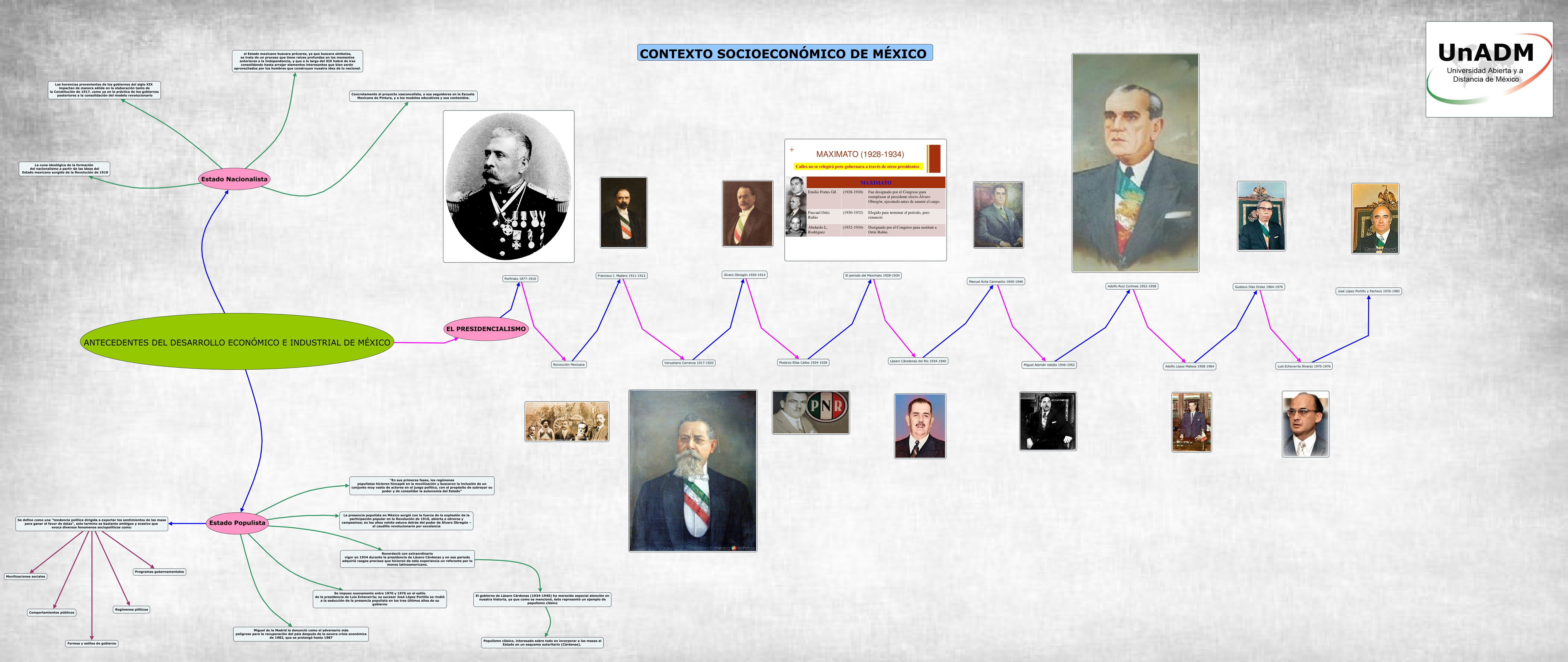 Este Cmap, tiene información relacionada con: MCSM_U2_A1_FORO, Adolfo Ruiz Cortines 1952-1958 Adolfo López Mateos 1958-1964, Estado Populista Se define como una "tendencia política dirigida a exportar los sentimientos de las masa para ganar el favor de éstas", este termino es bastante ambiguo y evasivo que evoca diversos fenomenos sociopolíticos como:, Francisco I. Madero 1911-1913 Venustiano Carranza 1917-1920, Estado Nacionalista Las herencias provenientes de los gobiernos del siglo XIX impactan de manera sólida en la elaboración tanto de la Constitución de 1917, como ya en la práctica de los gobiernos posteriores a la consolidación del modelo revolucionario, Estado Populista Se impuso nuevamente entre 1970 y 1976 en el estilo de la presidencia de Luis Echeverría; su sucesor José López Portillo se rindió a la seducción de la presencia populista en los tres últimos años de su gobierno, Estado Populista La presencia populista en México surgió con la fuerza de la explosión de la participación popular en la Revolución de 1910, abierta a obreros y campesinos; en los años veinte estuvo detrás del poder de Álvaro Obregón – el caudillo revolucionario por excelencia, EL PRESIDENCIALISMO Porfiriato 1877-1910, Álvaro Obregón 1920-1914 Plutarco Elías Calles 1924-1928, Plutarco Elías Calles 1924-1928 El periodo del Maximato 1928-1934, El periodo del Maximato 1928-1934 Lázaro Cáredenas del Río 1934-1940, Se define como una "tendencia política dirigida a exportar los sentimientos de las masa para ganar el favor de éstas", este termino es bastante ambiguo y evasivo que evoca diversos fenomenos sociopolíticos como: Formas y estilos de gobierno, ANTECEDENTES DEL DESARROLLO ECONÓMICO E INDUSTRIAL DE MÉXICO Estado Nacionalista, ANTECEDENTES DEL DESARROLLO ECONÓMICO E INDUSTRIAL DE MÉXICO Estado Populista, Lázaro Cáredenas del Río 1934-1940 Manuel Ávila Canmacho 1940-1946, Adolfo López Mateos 1958-1964 Gustavo Díaz Ordaz 1964-1970, Se define como una "tendencia política dirigida a exportar los sentimientos de las masa para ganar el favor de éstas", este termino es bastante ambiguo y evasivo que evoca diversos fenomenos sociopolíticos como: Regímenes pilíticos, Miguel Alemán Valdés 1946-1952 Adolfo Ruiz Cortines 1952-1958, Venustiano Carranza 1917-1920 Álvaro Obregón 1920-1914, Luís Echeverría Álvarez 1970-1976 José López Portillo y Pacheco 1976-1982, Manuel Ávila Canmacho 1940-1946 Miguel Alemán Valdés 1946-1952