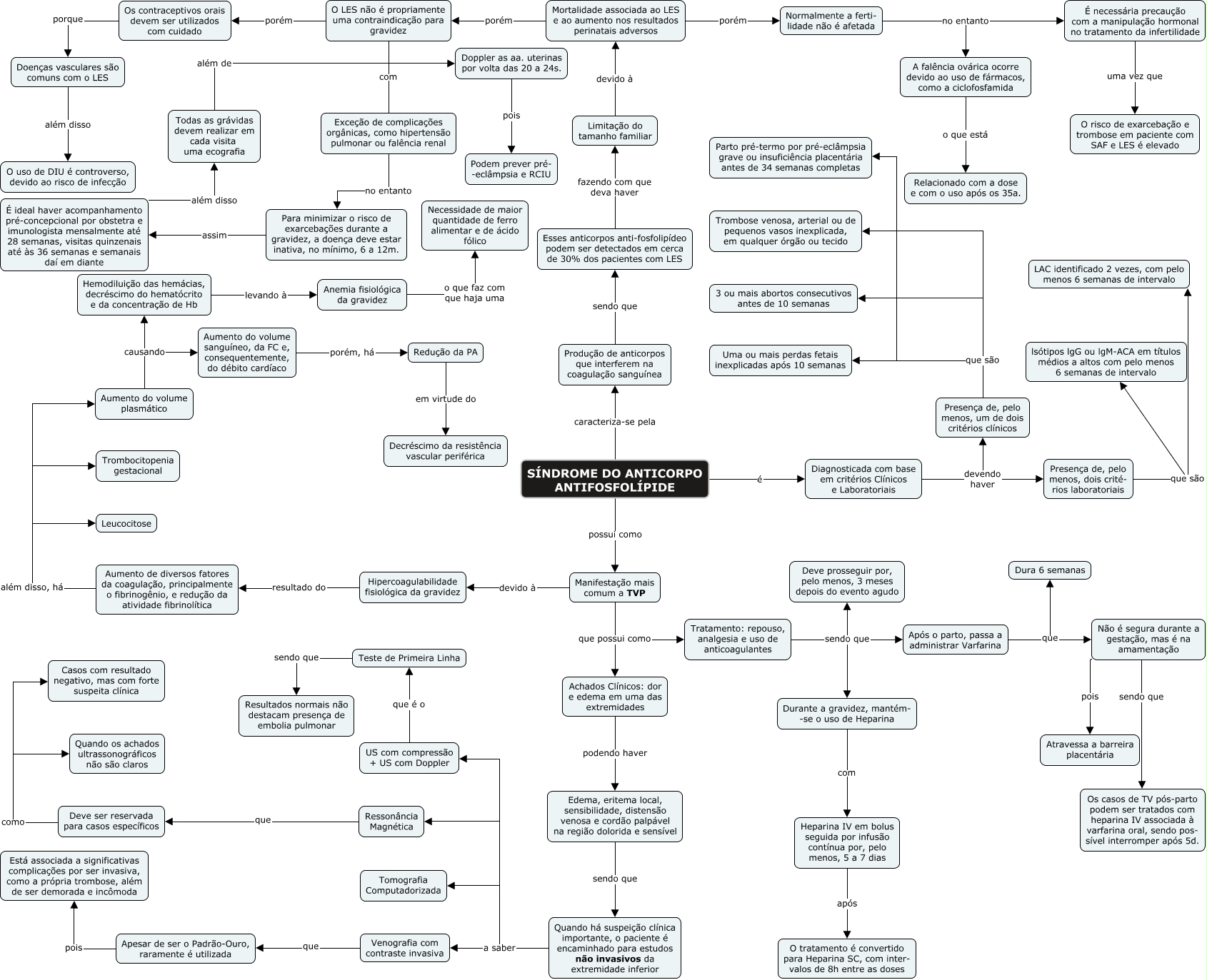 Esse mapa conceitual, produzido no IHMC CmapTools, tem a informação relacionada a: SAF, Normalmente a ferti- lidade não é afetada no entanto É necessária precaução com a manipulação hormonal no tratamento da infertilidade, Presença de, pelo menos, um de dois critérios clínicos que são 3 ou mais abortos consecutivos antes de 10 semanas, Presença de, pelo menos, dois crité- rios laboratoriais que são lsótipos lgG ou lgM-ACA em títulos médios a altos com pelo menos 6 semanas de intervalo, Doppler as aa. uterinas por volta das 20 a 24s. pois Podem prever pré- -eclâmpsia e RCIU, É ideal haver acompanhamento pré-concepcional por obstetra e imunologista mensalmente até 28 semanas, visitas quinzenais até às 36 semanas e semanais daí em diante além disso Todas as grávidas devem realizar em cada visita uma ecografia, Heparina IV em bolus seguida por infusão contínua por, pelo menos, 5 a 7 dias após O tratamento é convertido para Heparina SC, com inter- valos de 8h entre as doses, Deve ser reservada para casos específicos como Casos com resultado negativo, mas com forte suspeita clínica, Esses anticorpos anti-fosfolipídeo podem ser detectados em cerca de 30% dos pacientes com LES fazendo com que deva haver Limitação do tamanho familiar, Ressonância Magnética que Deve ser reservada para casos específicos, Doenças vasculares são comuns com o LES além disso O uso de DIU é controverso, devido ao risco de infecção, Não é segura durante a gestação, mas é na amamentação sendo que Os casos de TV pós-parto podem ser tratados com heparina IV associada à varfarina oral, sendo pos- sível interromper após 5d., Hipercoagulabilidade fisiológica da gravidez resultado do Aumento de diversos fatores da coagulação, principalmente o fibrinogênio, e redução da atividade fibrinolítica, Venografia com contraste invasiva que Apesar de ser o Padrão-Ouro, raramente é utilizada, Quando há suspeição clínica importante, o paciente é encaminhado para estudos não invasivos da extremidade inferior a saber Venografia com contraste invasiva, US com compressão + US com Doppler que é o Teste de Primeira Linha, Quando há suspeição clínica importante, o paciente é encaminhado para estudos não invasivos da extremidade inferior a saber Tomografia Computadorizada, É necessária precaução com a manipulação hormonal no tratamento da infertilidade uma vez que O risco de exarcebação e trombose em paciente com SAF e LES é elevado, Diagnosticada com base em critérios Clínicos e Laboratoriais devendo haver Presença de, pelo menos, um de dois critérios clínicos, Redução da PA em virtude do Decréscimo da resistência vascular periférica, Para minimizar o risco de exarcebações durante a gravidez, a doença deve estar inativa, no mínimo, 6 a 12m. assim É ideal haver acompanhamento pré-concepcional por obstetra e imunologista mensalmente até 28 semanas, visitas quinzenais até às 36 semanas e semanais daí em diante