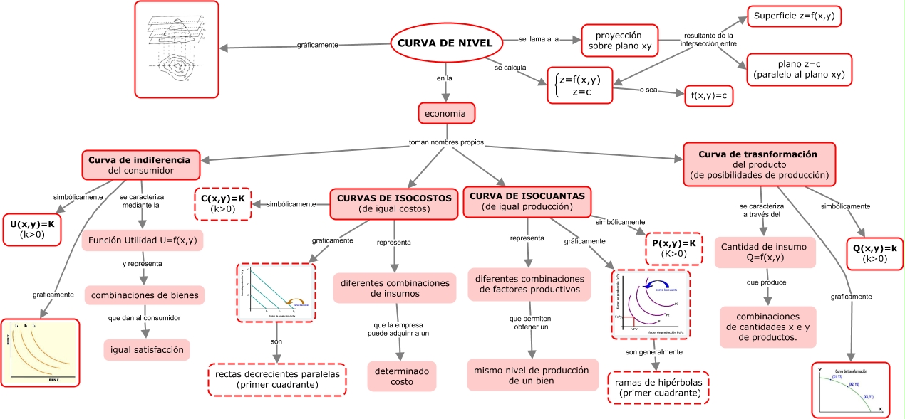 z=c </mtext> </mfenced> <mtext> </mtext> </mrow> </math>, CURVA DE NIVEL se llama a la proyección sobre plano xy, Cantidad de insumo Q=f(x,y) que produce combinaciones de cantidades x e y de productos., diferentes combinaciones de factores productivos que permiten obtener un mismo nivel de producción de un bien, Curva de indiferencia del consumidor gráficamente, proyección sobre plano xy resultante de la intersección entre plano z=c (paralelo al plano xy), Curva de indiferencia del consumidor se caracteriza mediante la Función Utilidad U=f(x,y), economía toman nombres propios CURVAS DE ISOCOSTOS (de igual costos), combinaciones de bienes que dan al consumidor igual satisfacción, economía toman nombres propios CURVA DE ISOCUANTAS (de igual producción), CURVA DE ISOCUANTAS (de igual producción) simbólicamente P(x,y)=K (Kɬ), CURVA DE NIVEL gráficamente, Curva de trasnformación del producto (de posibilidades de producción) graficamente, <math xmlns="http://www.w3.org/1998/Math/MathML"> <mrow> <mfenced open="{" close=""> <mtext> z=f(x,y)