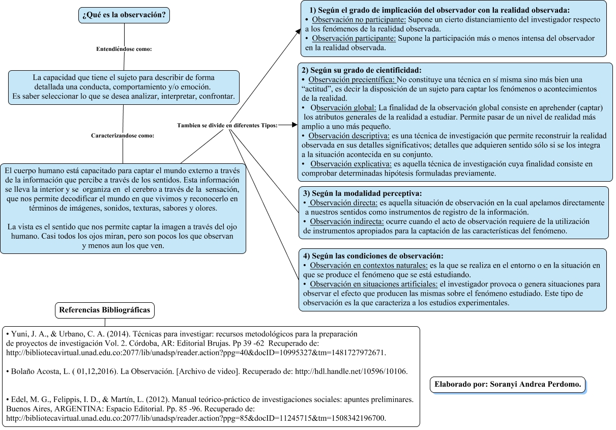 Este Cmap, tiene información relacionada con: Observación - Soranyi Andrea Perdomo, El cuerpo humano está capacitado para captar el mundo externo a través de la información que percibe a través de los sentidos. Esta información se lleva la interior y se organiza en el cerebro a través de la sensación, que nos permite decodificar el mundo en que vivimos y reconocerlo en términos de imágenes, sonidos, texturas, sabores y olores. La vista es el sentido que nos permite captar la imagen a través del ojo humano. Casi todos los ojos miran, pero son pocos los que observan y menos aun los que ven. Tambien se divide en diferentes Tipos: 2) Según su grado de cientificidad: • Observación precientífica: No constituye una técnica en sí misma sino más bien una “actitud”, es decir la disposición de un sujeto para captar los fenómenos o acontecimientos de la realidad. • Observación global: La finalidad de la observación global consiste en aprehender (captar) los atributos generales de la realidad a estudiar. Permite pasar de un nivel de realidad más amplio a uno más pequeño. • Observación descriptiva: es una técnica de investigación que permite reconstruir la realidad observada en sus detalles significativos; detalles que adquieren sentido sólo si se los integra a la situación acontecida en su conjunto. • Observación explicativa: es aquella técnica de investigación cuya finalidad consiste en comprobar determinadas hipótesis formuladas previamente., El cuerpo humano está capacitado para captar el mundo externo a través de la información que percibe a través de los sentidos. Esta información se lleva la interior y se organiza en el cerebro a través de la sensación, que nos permite decodificar el mundo en que vivimos y reconocerlo en términos de imágenes, sonidos, texturas, sabores y olores. La vista es el sentido que nos permite captar la imagen a través del ojo humano. Casi todos los ojos miran, pero son pocos los que observan y menos aun los que ven. Tambien se divide en diferentes Tipos: 4) Según las condiciones de observación: • Observación en contextos naturales: es la que se realiza en el entorno o en la situación en que se produce el fenómeno que se está estudiando. • Observación en situaciones artificiales: el investigador provoca o genera situaciones para observar el efecto que producen las mismas sobre el fenómeno estudiado. Este tipo de observación es la que caracteriza a los estudios experimentales., Referencias Bibliográficas • Yuni, J. A., & Urbano, C. A. (2014). Técnicas para investigar: recursos metodológicos para la preparación de proyectos de investigación Vol. 2. Córdoba, AR: Editorial Brujas. Pp 39 -62 Recuperado de: http://bibliotecavirtual.unad.edu.co:2077/lib/unadsp/reader.action?ppg=40&docID=10995327&tm=1481727972671. • Bolaño Acosta, L. ( 01,12,2016). La Observación. [Archivo de video]. Recuperado de: http://hdl.handle.net/10596/10106. • Edel, M. G., Felippis, I. D., & Martín, L. (2012). Manual teórico-práctico de investigaciones sociales: apuntes preliminares. Buenos Aires, ARGENTINA: Espacio Editorial. Pp. 85 -96. Recuperado de: http://bibliotecavirtual.unad.edu.co:2077/lib/unadsp/reader.action?ppg=85&docID=11245715&tm=1508342196700., El cuerpo humano está capacitado para captar el mundo externo a través de la información que percibe a través de los sentidos. Esta información se lleva la interior y se organiza en el cerebro a través de la sensación, que nos permite decodificar el mundo en que vivimos y reconocerlo en términos de imágenes, sonidos, texturas, sabores y olores. La vista es el sentido que nos permite captar la imagen a través del ojo humano. Casi todos los ojos miran, pero son pocos los que observan y menos aun los que ven. Tambien se divide en diferentes Tipos: 1) Según el grado de implicación del observador con la realidad observada: • Observación no participante: Supone un cierto distanciamiento del investigador respecto a los fenómenos de la realidad observada. • Observación participante: Supone la participación más o menos intensa del observador en la realidad observada., El cuerpo humano está capacitado para captar el mundo externo a través de la información que percibe a través de los sentidos. Esta información se lleva la interior y se organiza en el cerebro a través de la sensación, que nos permite decodificar el mundo en que vivimos y reconocerlo en términos de imágenes, sonidos, texturas, sabores y olores. La vista es el sentido que nos permite captar la imagen a través del ojo humano. Casi todos los ojos miran, pero son pocos los que observan y menos aun los que ven. Tambien se divide en diferentes Tipos: 3) Según la modalidad perceptiva: • Observación directa: es aquella situación de observación en la cual apelamos directamente a nuestros sentidos como instrumentos de registro de la información. • Observación indirecta: ocurre cuando el acto de observación requiere de la utilización de instrumentos apropiados para la captación de las características del fenómeno., ¿Qué es la observación? Entendiéndose como: La capacidad que tiene el sujeto para describir de forma detallada una conducta, comportamiento y/o emoción. Es saber seleccionar lo que se desea analizar, interpretar, confrontar., La capacidad que tiene el sujeto para describir de forma detallada una conducta, comportamiento y/o emoción. Es saber seleccionar lo que se desea analizar, interpretar, confrontar. Caracterizandose como: El cuerpo humano está capacitado para captar el mundo externo a través de la información que percibe a través de los sentidos. Esta información se lleva la interior y se organiza en el cerebro a través de la sensación, que nos permite decodificar el mundo en que vivimos y reconocerlo en términos de imágenes, sonidos, texturas, sabores y olores. La vista es el sentido que nos permite captar la imagen a través del ojo humano. Cas