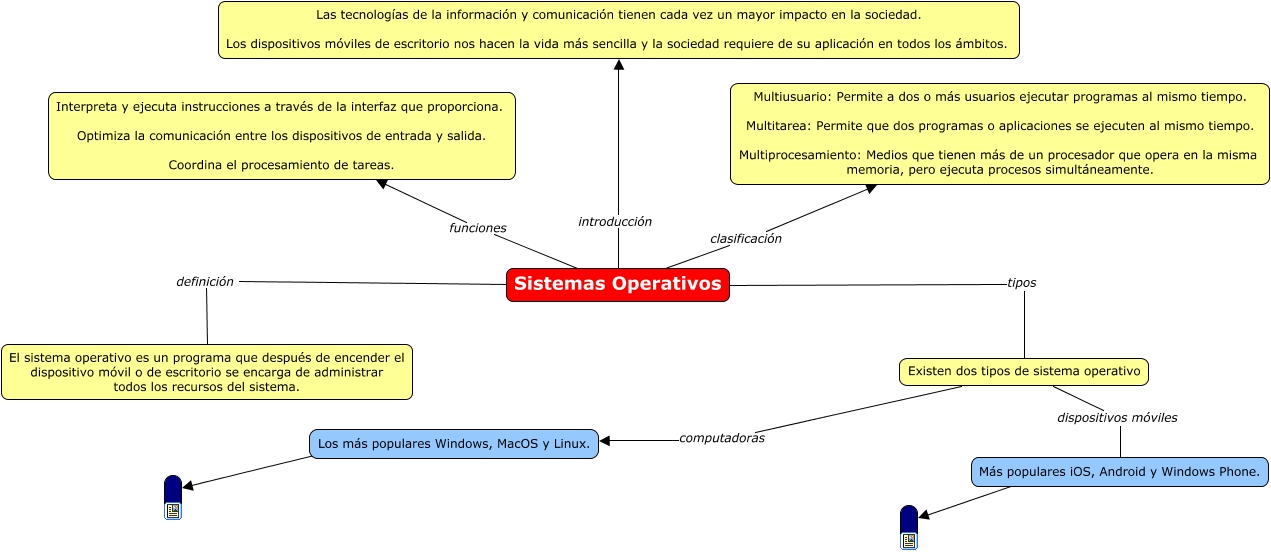 Este Cmap, tiene información relacionada con: sistemas operativos, Sistemas Operativos funciones Interpreta y ejecuta instrucciones a través de la interfaz que proporciona. Optimiza la comunicación entre los dispositivos de entrada y salida. Coordina el procesamiento de tareas., Sistemas Operativos tipos Existen dos tipos de sistema operativo, Los más populares Windows, MacOS y Linux. ????, Sistemas Operativos definición El sistema operativo es un programa que después de encender el dispositivo móvil o de escritorio se encarga de administrar todos los recursos del sistema., Sistemas Operativos clasificación Multiusuario: Permite a dos o más usuarios ejecutar programas al mismo tiempo. Multitarea: Permite que dos programas o aplicaciones se ejecuten al mismo tiempo. Multiprocesamiento: Medios que tienen más de un procesador que opera en la misma memoria, pero ejecuta procesos simultáneamente., Más populares iOS, Android y Windows Phone. ????, Sistemas Operativos introducción Las tecnologías de la información y comunicación tienen cada vez un mayor impacto en la sociedad. Los dispositivos móviles de escritorio nos hacen la vida más sencilla y la sociedad requiere de su aplicación en todos los ámbitos., Existen dos tipos de sistema operativo dispositivos móviles Más populares iOS, Android y Windows Phone., Existen dos tipos de sistema operativo computadoras Los más populares Windows, MacOS y Linux.