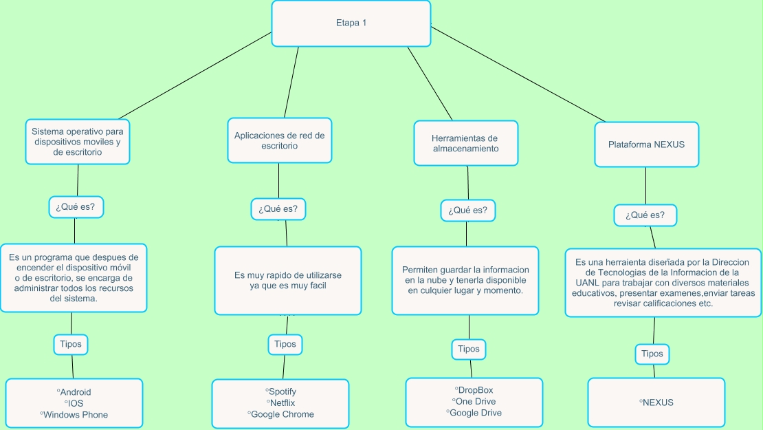 Este Cmap, tiene información relacionada con: Etapa 1, Es un programa que despues de encender el dispositivo móvil o de escritorio, se encarga de administrar todos los recursos del sistema. ???? ¿Qué es?, °Spotify °Netflix °Google Chrome ???? Tipos, Tipos ???? Es un programa que despues de encender el dispositivo móvil o de escritorio, se encarga de administrar todos los recursos del sistema., Es muy rapido de utilizarse ya que es muy facil ???? ¿Qué es?, Herramientas de almacenamiento ???? Etapa 1, Es muy rapido de utilizarse ya que es muy facil ???? ¿Qué es?, °Android °IOS °Windows Phone ???? Tipos, ¿Qué es? ???? Herramientas de almacenamiento, ¿Qué es? ???? Aplicaciones de red de escritorio, Es una herraienta diseñada por la Direccion de Tecnologias de la Informacion de la UANL para trabajar con diversos materiales educativos, presentar examenes,enviar tareas revisar calificaciones etc. ???? ¿Qué es?, ¿Qué es? ???? Plataforma NEXUS, Tipos ???? Es muy rapido de utilizarse ya que es muy facil, Sistema operativo para dispositivos moviles y de escritorio ???? Etapa 1, Tipos ???? Permiten guardar la informacion en la nube y tenerla disponible en culquier lugar y momento., Plataforma NEXUS ???? Etapa 1, °DropBox °One Drive °Google Drive ???? Tipos, Aplicaciones de red de escritorio ???? Etapa 1, Permiten guardar la informacion en la nube y tenerla disponible en culquier lugar y momento. ???? ¿Qué es?, Tipos ???? Es un programa que despues de encender el dispositivo móvil o de escritorio, se encarga de administrar todos los recursos del sistema., Tipos ???? Es un programa que despues de encender el dispositivo móvil o de escritorio, se encarga de administrar todos los recursos del sistema.