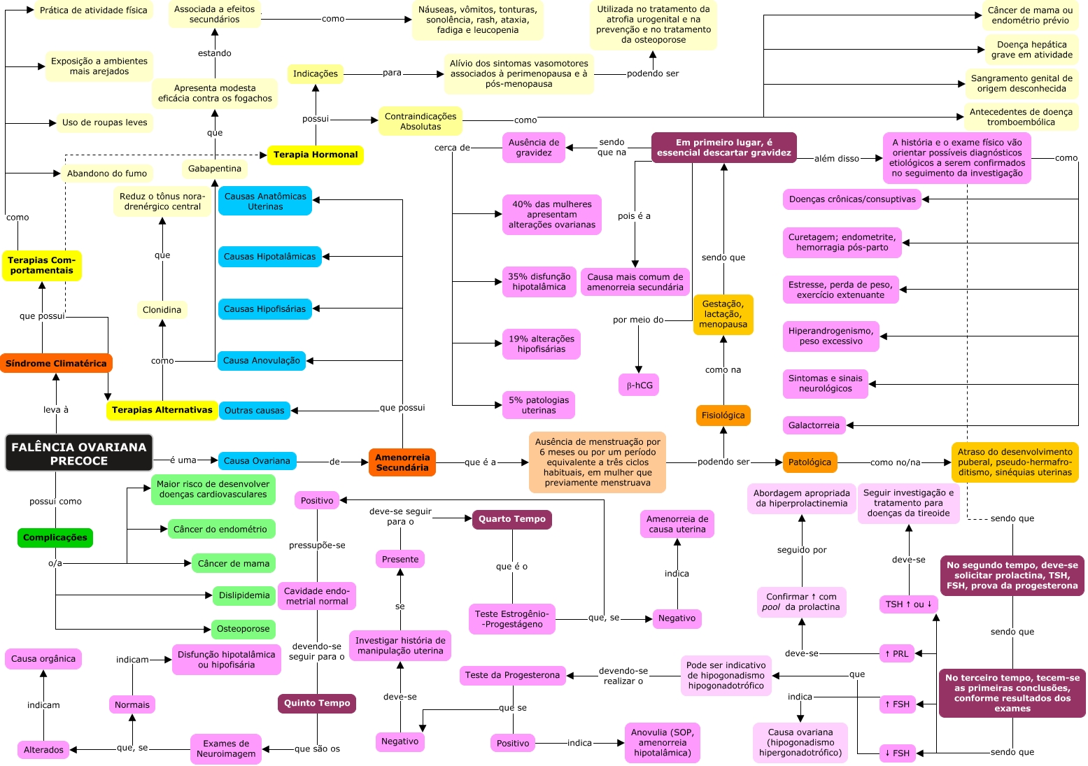 Esse mapa conceitual, produzido no IHMC CmapTools, tem a informação relacionada a: Falência Ovariana Precoce, Contraindicações Absolutas como Antecedentes de doença tromboembólica, No terceiro tempo, tecem-se as primeiras conclusões, conforme resultados dos exames sendo que TSH ↑ ou ↓, Alterados indicam Causa orgânica, Amenorreia Secundária que possui Causas Hipofisárias, Ausência de gravidez cerca de 19% alterações hipofisárias, Terapias Com- portamentais como Exposição a ambientes mais arejados, Alívio dos sintomas vasomotores associados à perimenopausa e à pós-menopausa podendo ser Utilizada no tratamento da atrofia urogenital e na prevenção e no tratamento da osteoporose, Complicações o/a Câncer do endométrio, A história e o exame físico vão orientar possíveis diagnósticos etiológicos a serem confirmados no seguimento da investigação como Galactorreia, Amenorreia Secundária que é a Ausência de menstruação por 6 meses ou por um período equivalente a três ciclos habituais, em mulher que previamente menstruava, Complicações o/a Câncer de mama, Ausência de gravidez cerca de 35% disfunção hipotalâmica, Terapias Com- portamentais como Prática de atividade física, Positivo indica Anovulia (SOP, amenorreia hipotalâmica), Ausência de menstruação por 6 meses ou por um período equivalente a três ciclos habituais, em mulher que previamente menstruava podendo ser Patológica, Exames de Neuroimagem que, se Alterados, Ausência de menstruação por 6 meses ou por um período equivalente a três ciclos habituais, em mulher que previamente menstruava podendo ser Fisiológica, Contraindicações Absolutas como Sangramento genital de origem desconhecida, Ausência de gravidez cerca de 5% patologias uterinas, FALÊNCIA OVARIANA PRECOCE possui como Complicações