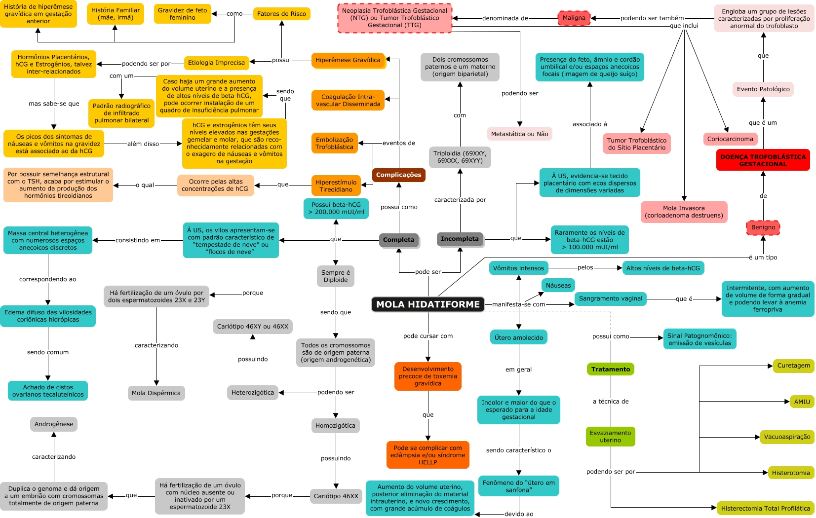 Esse mapa conceitual, produzido no IHMC CmapTools, tem a informação relacionada a: Mola Hidatiforme, Neoplasia Trofoblástica Gestacional (NTG) ou Tumor Trofoblástico Gestacional (TTG) que inclui Coriocarcinoma, Caso haja um grande aumento do volume uterino e a presença de altos níveis de beta-hCG, pode ocorrer instalação de um quadro de insuficiência pulmonar com um Padrão radiográfico de infiltrado pulmonar bilateral, Fatores de Risco como Gravidez de feto feminino, Neoplasia Trofoblástica Gestacional (NTG) ou Tumor Trofoblástico Gestacional (TTG) que inclui Mola Invasora (corioadenoma destruens), MOLA HIDATIFORME pode ser Incompleta, Edema difuso das vilosidades coriônicas hidrópicas sendo comum Achado de cistos ovarianos tecaluteínicos, Heterozigótica possuindo Cariótipo 46XY ou 46XX, Complicações eventos de Hiperêmese Gravídica, Etiologia Imprecisa podendo ser por Hormônios Placentários, hCG e Estrogênios, talvez inter-relacionados, Esvaziamento uterino podendo ser por Histerotomia, Todos os cromossomos são de origem paterna (origem androgenética) podendo ser Heterozigótica, MOLA HIDATIFORME manifesta-se com Vômitos intensos, Hormônios Placentários, hCG e Estrogênios, talvez inter-relacionados mas sabe-se que Os picos dos sintomas de náuseas e vômitos na gravidez está associado ao da hCG, Triploidia (69XXY, 69XXX, 69XYY) com Dois cromossomos paternos e um materno (origem biparietal), MOLA HIDATIFORME manifesta-se com Náuseas, Evento Patológico que Engloba um grupo de lesões caracterizadas por proliferação anormal do trofoblasto, Esvaziamento uterino podendo ser por Vacuoaspiração, Tratamento a técnica de Esvaziamento uterino, hCG e estrogênios têm seus níveis elevados nas gestações gemelar e molar, que são reco- nhecidamente relacionadas com o exagero de náuseas e vômitos na gestação sendo que Caso haja um grande aumento do volume uterino e a presença de altos níveis de beta-hCG, pode ocorrer instalação de um quadro de insuficiência pulmonar, Fatores de Risco como História de hiperêmese gravídica em gestação anterior