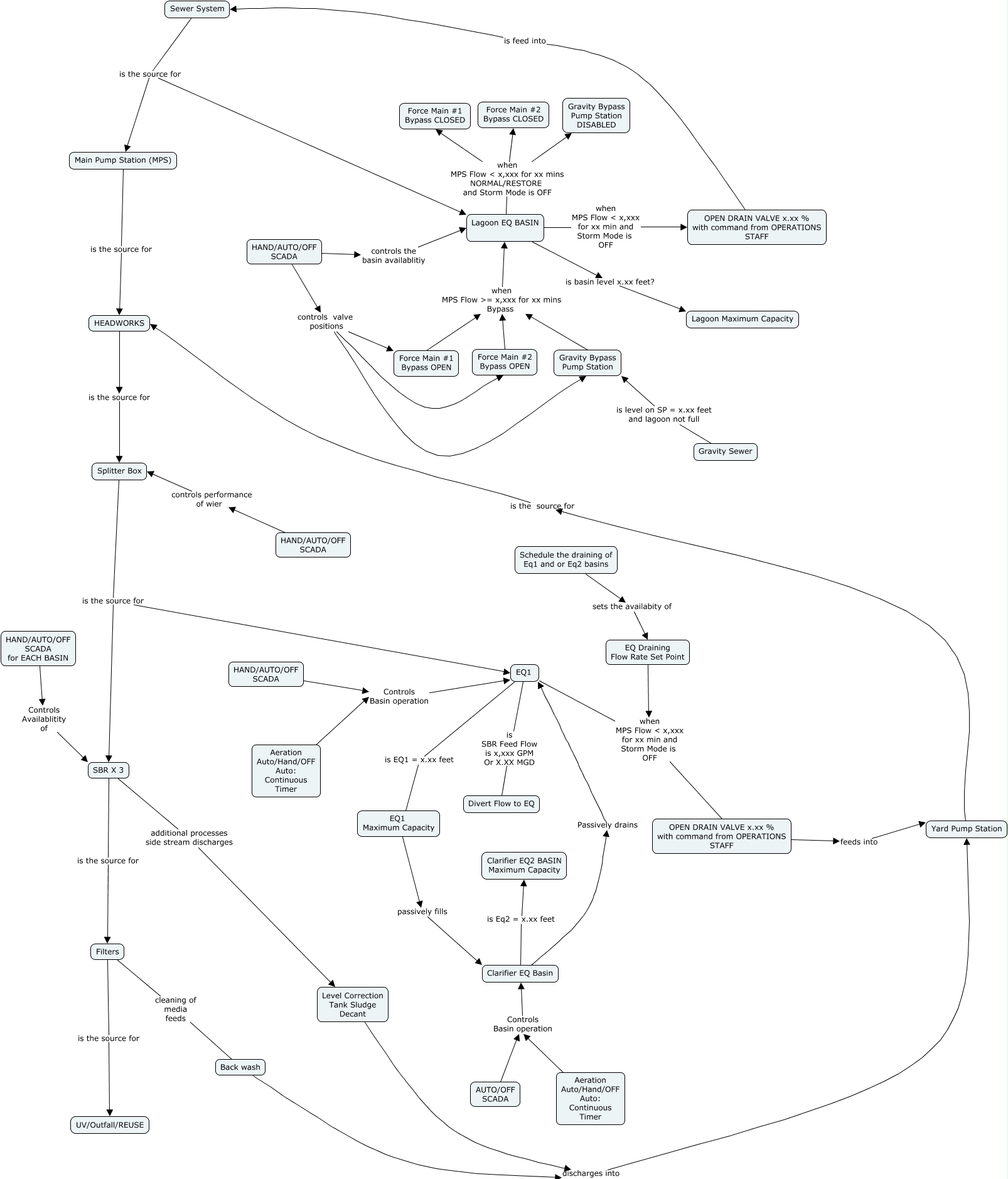 This Concept Map, created with IHMC CmapTools, has information related to: Wolf Creek Flow Management Version 3, EQ Draining Flow Rate Set Point when MPS Flow < x,xxx for xx min and Storm Mode is OFF OPEN DRAIN VALVE x.xx % with command from OPERATIONS STAFF, Filters cleaning of media feeds Back wash, HAND/AUTO/OFF SCADA Controls Basin operation EQ1, Splitter Box is the source for SBR X 3, Force Main #2 Bypass OPEN when MPS Flow >= x,xxx for xx mins Bypass Lagoon EQ BASIN, Aeration Auto/Hand/OFF Auto: Continuous Timer Controls Basin operation EQ1, Lagoon EQ BASIN is basin level x.xx feet? Lagoon Maximum Capacity, Force Main #1 Bypass OPEN when MPS Flow >= x,xxx for xx mins Bypass Lagoon EQ BASIN, Gravity Bypass Pump Station when MPS Flow >= x,xxx for xx mins Bypass Lagoon EQ BASIN, HAND/AUTO/OFF SCADA controls valve positions Force Main #1 Bypass OPEN, Sewer System is the source for Lagoon EQ BASIN, OPEN DRAIN VALVE x.xx % with command from OPERATIONS STAFF feeds into Yard Pump Station, Lagoon EQ BASIN when MPS Flow < x,xxx for xx mins NORMAL/RESTORE and Storm Mode is OFF Force Main #2 Bypass CLOSED, EQ1 Maximum Capacity passively fills Clarifier EQ Basin, Lagoon EQ BASIN when MPS Flow < x,xxx for xx mins NORMAL/RESTORE and Storm Mode is OFF Force Main #1 Bypass CLOSED, HAND/AUTO/OFF SCADA for EACH BASIN Controls Availablitity of SBR X 3, EQ1 when MPS Flow < x,xxx for xx min and Storm Mode is OFF OPEN DRAIN VALVE x.xx % with command from OPERATIONS STAFF, Yard Pump Station is the source for HEADWORKS, EQ1 is SBR Feed Flow is x,xxx GPM Or X.XX MGD Divert Flow to EQ, Back wash discharges into Yard Pump Station