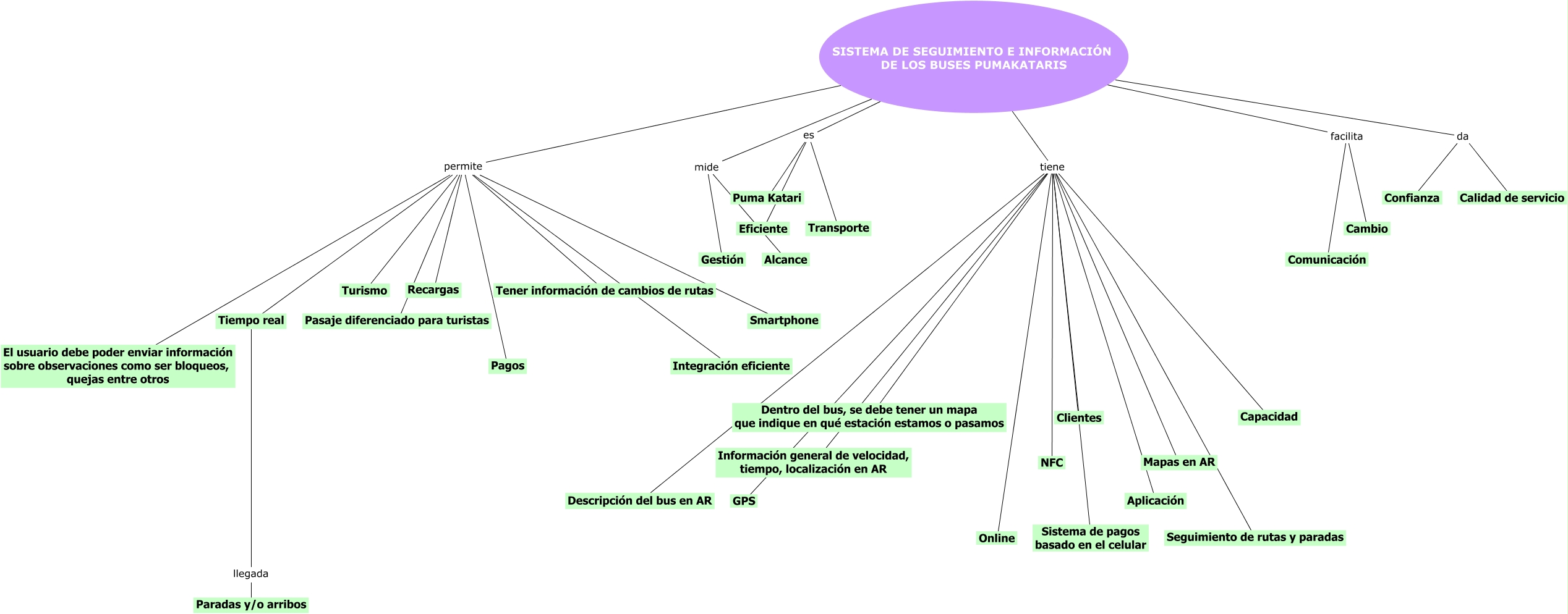 Este Cmap, tiene información relacionada con: Ideas para proyecto, SISTEMA DE SEGUIMIENTO E INFORMACIÓN DE LOS BUSES PUMAKATARIS permite Pasaje diferenciado para turistas, SISTEMA DE SEGUIMIENTO E INFORMACIÓN DE LOS BUSES PUMAKATARIS facilita Cambio, SISTEMA DE SEGUIMIENTO E INFORMACIÓN DE LOS BUSES PUMAKATARIS tiene Aplicación, Tiempo real llegada Paradas y/o arribos, SISTEMA DE SEGUIMIENTO E INFORMACIÓN DE LOS BUSES PUMAKATARIS permite Tener información de cambios de rutas, SISTEMA DE SEGUIMIENTO E INFORMACIÓN DE LOS BUSES PUMAKATARIS permite Tiempo real, SISTEMA DE SEGUIMIENTO E INFORMACIÓN DE LOS BUSES PUMAKATARIS facilita Comunicación, SISTEMA DE SEGUIMIENTO E INFORMACIÓN DE LOS BUSES PUMAKATARIS tiene Mapas en AR, SISTEMA DE SEGUIMIENTO E INFORMACIÓN DE LOS BUSES PUMAKATARIS tiene Capacidad, SISTEMA DE SEGUIMIENTO E INFORMACIÓN DE LOS BUSES PUMAKATARIS tiene Clientes, SISTEMA DE SEGUIMIENTO E INFORMACIÓN DE LOS BUSES PUMAKATARIS tiene Dentro del bus, se debe tener un mapa que indique en qué estación estamos o pasamos, SISTEMA DE SEGUIMIENTO E INFORMACIÓN DE LOS BUSES PUMAKATARIS mide Alcance, SISTEMA DE SEGUIMIENTO E INFORMACIÓN DE LOS BUSES PUMAKATARIS permite Recargas, SISTEMA DE SEGUIMIENTO E INFORMACIÓN DE LOS BUSES PUMAKATARIS permite Smartphone, SISTEMA DE SEGUIMIENTO E INFORMACIÓN DE LOS BUSES PUMAKATARIS permite Turismo, SISTEMA DE SEGUIMIENTO E INFORMACIÓN DE LOS BUSES PUMAKATARIS permite El usuario debe poder enviar información sobre observaciones como ser bloqueos, quejas entre otros, SISTEMA DE SEGUIMIENTO E INFORMACIÓN DE LOS BUSES PUMAKATARIS da Confianza, SISTEMA DE SEGUIMIENTO E INFORMACIÓN DE LOS BUSES PUMAKATARIS mide Gestión, SISTEMA DE SEGUIMIENTO E INFORMACIÓN DE LOS BUSES PUMAKATARIS permite Integración eficiente, SISTEMA DE SEGUIMIENTO E INFORMACIÓN DE LOS BUSES PUMAKATARIS tiene Online