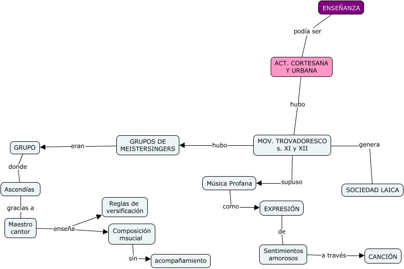 Este Cmap, tiene información relacionada con: E .M. Enseñanza Act. Cortesana y Urbana, GRUPOS DE MEISTERSINGERS eran GRUPO, MOV. TROVADORESCO s. XI y XII hubo GRUPOS DE MEISTERSINGERS, Composición msucial sin acompañamiento, ACT. CORTESANA Y URBANA hubo MOV. TROVADORESCO s. XI y XII, Ascendías gracias a Maestro cantor, MOV. TROVADORESCO s. XI y XII genera SOCIEDAD LAICA, Sentimientos amorosos a través CANCIÓN, EXPRESIÓN de Sentimientos amorosos, Música Profana como EXPRESIÓN, GRUPO donde Ascendías, MOV. TROVADORESCO s. XI y XII supuso Música Profana, Maestro cantor enseña Composición msucial, Maestro cantor enseña Reglas de versificación, ENSEÑANZA podía ser ACT. CORTESANA Y URBANA