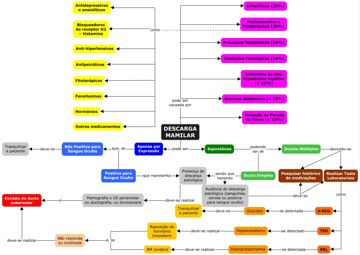 Esse mapa conceitual, produzido no IHMC CmapTools, tem a informação relacionada a: Descarga Mamilar, DESCARGA MAMILAR pode ser causada por Processos Neoplásicos (18%), Não Positiva para Sangue Oculto deve-se Tranquilizar a paciente, Realizar Teste Laboratoriais como PRL, Reposição de hormônio tireoidiano e, se Não resolvida ou incômoda, Realizar Teste Laboratoriais como TSH, Ductos Múltiplos devendo-se Realizar Teste Laboratoriais, Medicamentos e Fitoterápicos (20%) como Anti-hipertensivos, Apenas por Expressão que, se Positiva para Sangue Oculto, DESCARGA MAMILAR pode ser causada por Irritação na Parede do Tórax (< 10%), TSH se detectado Hipotireoidismo, DESCARGA MAMILAR pode ser causada por Idiopáticas (35%), PRL se detectada Hiperprolactinemia, DESCARGA MAMILAR pode ser Espontânea, RM cerebral e, se Não resolvida ou incômoda, Mamografia e US periareolar ou ductografia, ou ductoscopia e Excisão do ducto subareolar, Medicamentos e Fitoterápicos (20%) como Outros medicamentos, b-hCG se detectada Gravidez, Positiva para Sangue Oculto que representa Presença de descarga patológica, Medicamentos e Fitoterápicos (20%) como Antidepressivos e ansiolíticos, Presença de descarga patológica deve-se realizar Mamografia e US periareolar ou ductografia, ou ductoscopia