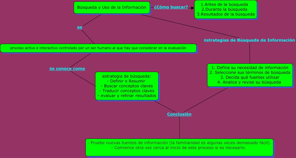 Este Cmap, tiene información relacionada con: Búsqueda y Uso de la Información, estrategia de búsqueda: - Definir o Resumir - Buscar conceptos claves - Traducir conceptos claves - evaluar y refinar resultados Conclusiòn - Pruebe nuevas fuentes de información (la familiaridad es algunas veces demasiado fácil). - Comience otra vez cerca al inicio de este proceso si es necesario., 1. Defina su necesidad de información 2. Seleccione sus términos de búsqueda 3. Decida qué fuentes utilizar 4. Analice y revise su búsqueda Conclusiòn - Pruebe nuevas fuentes de información (la familiaridad es algunas veces demasiado fácil). - Comience otra vez cerca al inicio de este proceso si es necesario., Búsqueda y Uso de la Información ¿Cómo buscar? 1. Antes de la búsqueda 2. Durante la búsqueda 3. Resultados de la búsqueda, proceso activo e interactivo controlado por un ser humano al que hay que considerar en la evaluación Se conoce como estrategia de búsqueda: - Definir o Resumir - Buscar conceptos claves - Traducir conceptos claves - evaluar y refinar resultados, Búsqueda y Uso de la Información es proceso activo e interactivo controlado por un ser humano al que hay que considerar en la evaluación, Búsqueda y Uso de la Información Estrategias de Búsqueda de Información 1. Defina su necesidad de información 2. Seleccione sus términos de búsqueda 3. Decida qué fuentes utilizar 4. Analice y revise su búsqueda