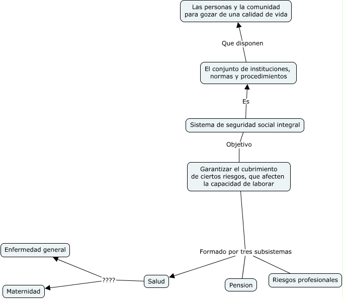 Este Cmap, tiene información relacionada con: SSSI, Garantizar el cubrimiento de ciertos riesgos, que afecten la capacidad de laborar Formado por tres subsistemas Salud, Garantizar el cubrimiento de ciertos riesgos, que afecten la capacidad de laborar Formado por tres subsistemas Riesgos profesionales, Salud ???? Maternidad, El conjunto de instituciones, normas y procedimientos Que disponen Las personas y la comunidad para gozar de una calidad de vida, Sistema de seguridad social integral Es El conjunto de instituciones, normas y procedimientos, Garantizar el cubrimiento de ciertos riesgos, que afecten la capacidad de laborar Formado por tres subsistemas Pension, Sistema de seguridad social integral Objetivo Garantizar el cubrimiento de ciertos riesgos, que afecten la capacidad de laborar, Salud ???? Enfermedad general