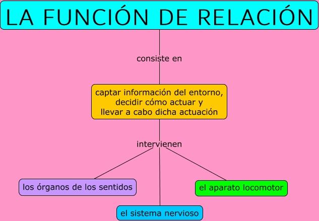 Este Cmap, tiene información relacionada con: La función de relación, captar información del entorno, decidir cómo actuar y llevar a cabo dicha actuación intervienen los órganos de los sentidos, LA FUNCIÓN DE RELACIÓN consiste en captar información del entorno, decidir cómo actuar y llevar a cabo dicha actuación, captar información del entorno, decidir cómo actuar y llevar a cabo dicha actuación intervienen el aparato locomotor, captar información del entorno, decidir cómo actuar y llevar a cabo dicha actuación intervienen el sistema nervioso