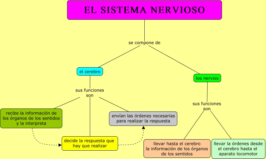 Este Cmap, tiene información relacionada con: El sistema nervioso, el cerebro sus funciones son envían las órdenes necesarias para realizar la respuesta, el cerebro sus funciones son recibe la información de los órganos de los sentidos y la interpreta, los nervios sus funciones son llevar la órdenes desde el cerebro hasta el aparato locomotor, EL SISTEMA NERVIOSO se compone de los nervios, recibe la información de los órganos de los sentidos y la interpreta decide la respuesta que hay que realizar, el cerebro sus funciones son decide la respuesta que hay que realizar, los nervios sus funciones son llevar hasta el cerebro la información de los órganos de los sentidos, EL SISTEMA NERVIOSO se compone de el cerebro, decide la respuesta que hay que realizar envían las órdenes necesarias para realizar la respuesta