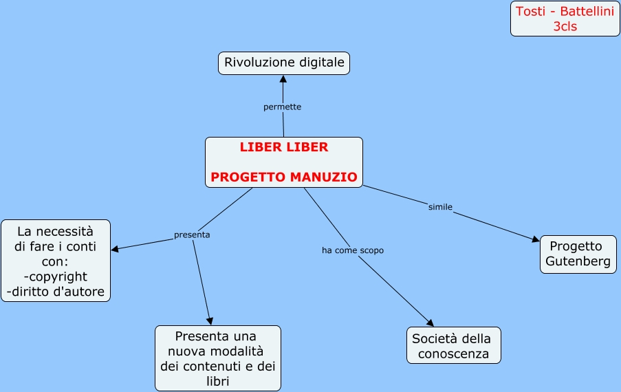 Questa Cmap, creata con IHMC CmapTools, contiene informazioni relative a: progetto Manunzio - Tosti Battellini, LIBER LIBER PROGETTO MANUZIO ha come scopo Società della conoscenza, LIBER LIBER PROGETTO MANUZIO permette Rivoluzione digitale, LIBER LIBER PROGETTO MANUZIO presenta Presenta una nuova modalità dei contenuti e dei libri, LIBER LIBER PROGETTO MANUZIO simile Progetto Gutenberg, LIBER LIBER PROGETTO MANUZIO presenta La necessità di fare i conti con: -copyright -diritto d'autore