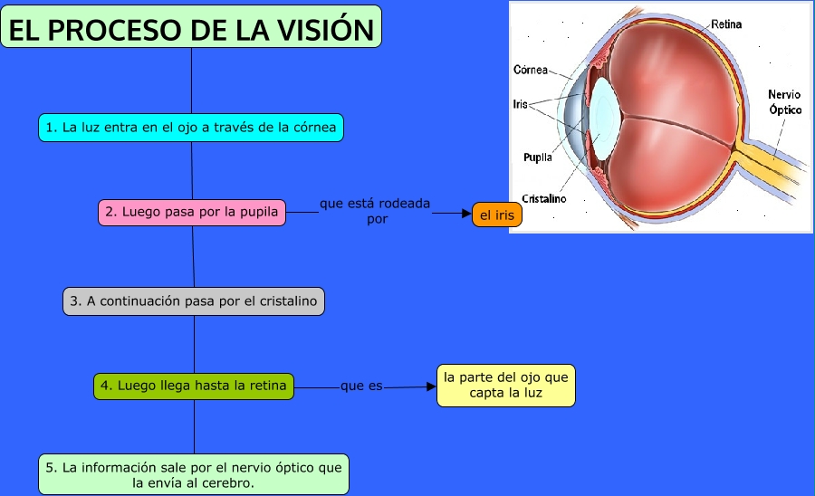 Este Cmap, tiene información relacionada con: El proceso de la visión, 2. Luego pasa por la pupila que está rodeada por el iris, 4. Luego llega hasta la retina 5. La información sale por el nervio óptico que la envía al cerebro., EL PROCESO DE LA VISIÓN 1. La luz entra en el ojo a través de la córnea, 2. Luego pasa por la pupila 3. A continuación pasa por el cristalino, 1. La luz entra en el ojo a través de la córnea 2. Luego pasa por la pupila, 4. Luego llega hasta la retina que es la parte del ojo que capta la luz, 3. A continuación pasa por el cristalino 4. Luego llega hasta la retina