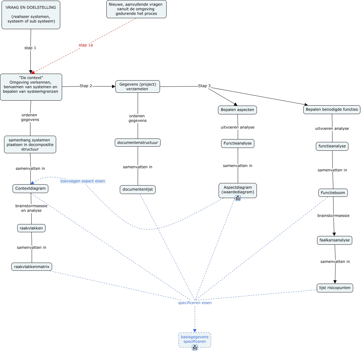 Deze Concept Map heeft informatie gerelateerd aan: proces ontwikkeling systeem, Bepalen aspecten uitvoeren analyse Functieanalyse, raakvlakkenmatrix specificeren eisen basisgegevens specificeren, "De context" Omgeving verkennen, benoemen van systemen en bepalen van systeemgrenzen ordenen gegevens samenhang systemen plaatsen in decompositie structuur, Aspectdiagram (waardediagram) specificeren eisen basisgegevens specificeren, Functieanalyse samenvatten in Aspectdiagram (waardediagram), functieanalyse samenvatten in Functieboom, Gegevens (project) verzamelen ordenen gegevens documentenstructuur, raakvlakken samenvatten in raakvlakkenmatrix, "De context" Omgeving verkennen, benoemen van systemen en bepalen van systeemgrenzen Stap 2 Gegevens (project) verzamelen, Gegevens (project) verzamelen Stap 3 Bepalen aspecten, samenhang systemen plaatsen in decompositie structuur samenvatten in Contextdiagram, documentenlijst specificeren eisen basisgegevens specificeren, Contextdiagram specificeren eisen basisgegevens specificeren, Gegevens (project) verzamelen Stap 3 Bepalen benodigde functies, Bepalen benodigde functies uitvoeren analyse functieanalyse, Nieuwe, aanvullende vragen vanuit de omgeving gedurende het proces stap 1a "De context" Omgeving verkennen, benoemen van systemen en bepalen van systeemgrenzen, documentenstructuur samenvatten in documentenlijst, Functieboom brainstormsessie faalkansanalyse, VRAAG EN DOELSTELLING (realiseer systemen, systeem of sub systeem) stap 1 "De context" Omgeving verkennen, benoemen van systemen en bepalen van systeemgrenzen, lijst risicopunten specificeren eisen basisgegevens specificeren