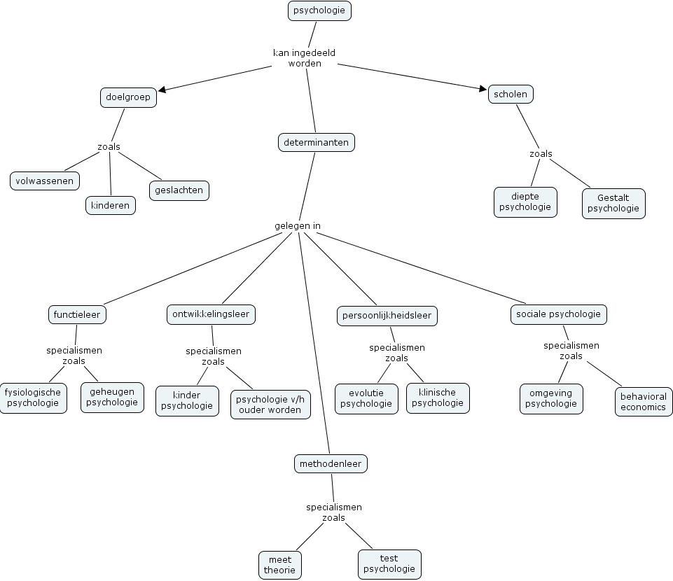 methodenleer specialismen zoals meet theorie, methodenleer specialismen zoals test psychologie, ontwikkelingsleer specialismen zoals psychologie v/h ouder worden, ontwikkelingsleer specialismen zoals kinder psychologie, determinanten gelegen in methodenleer, determinanten gelegen in ontwikkelingsleer, determinanten gelegen in functieleer, determinanten gelegen in persoonlijkheidsleer, determinanten gelegen in sociale psychologie, doelgroep zoals geslachten, doelgroep zoals kinderen, doelgroep zoals volwassenen, functieleer specialismen zoals fysiologische psychologie, functieleer specialismen zoals geheugen psychologie, persoonlijkheidsleer specialismen zoals evolutie psychologie, persoonlijkheidsleer specialismen zoals klinische psychologie, sociale psychologie specialismen zoals behavioral economics, sociale psychologie specialismen zoals omgeving psychologie, psychologie kan ingedeeld worden determinanten, psychologie kan ingedeeld worden scholen, psychologie kan ingedeeld worden doelgroep, scholen zoals Gestalt psychologie, scholen zoals diepte psychologie