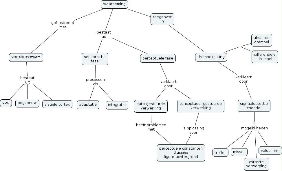 signaaldetectie theorie 4 mogelijkheden vals alarm, signaaldetectie theorie 4 mogelijkheden treffer, signaaldetectie theorie 4 mogelijkheden misser, signaaldetectie theorie 4 mogelijkheden correcte verwerping, waarneming bestaat uit sensorische fase, waarneming bestaat uit perceptuele fase, waarneming ???? drempelmeting, data-gestuurde verwerking heeft problemen met perceptuele constanten Illussies figuur-achtergrond, sensorische fase processen als integratie, sensorische fase processen als adaptatie, waarneming ge�llustreerd met visuele systeem, perceptuele fase verklaart door conceptueel-gestuurde verwerking, perceptuele fase verklaart door data-gestuurde verwerking, visuele systeem bestaat uit visuele cortex, visuele systeem bestaat uit oogzenuw, visuele systeem bestaat uit oog, conceptueel-gestuurde verwerking is oplossing voor perceptuele constanten Illussies figuur-achtergrond, drempelmeting verklaart door signaaldetectie theorie, drempelmeting absolute drempel, drempelmeting differentiele drempel