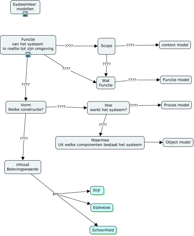 Deze Concept Map heeft informatie gerelateerd aan: systeemleer, Hoe werkt het systeem? ???? Waarmee Uit welke componenten bestaat het systeem, Functie van het systeem in realtie tot zijn omgeving ???? Wat Functie, inhoud Belevingswaarde are Esthetiek, Wat Functie ???? Functie model, Scope ???? Wat Functie, Functie van het systeem in realtie tot zijn omgeving ???? Vorm Welke constructie?, inhoud Belevingswaarde are Stijl, Vorm Welke constructie? ???? Hoe werkt het systeem?, Hoe werkt het systeem? ???? Proces model, inhoud Belevingswaarde are Schoonheid, Vorm Welke constructie? ???? inhoud Belevingswaarde, Scope ???? context model, Waarmee Uit welke componenten bestaat het systeem ???? Object model, Functie van het systeem in realtie tot zijn omgeving ???? Scope